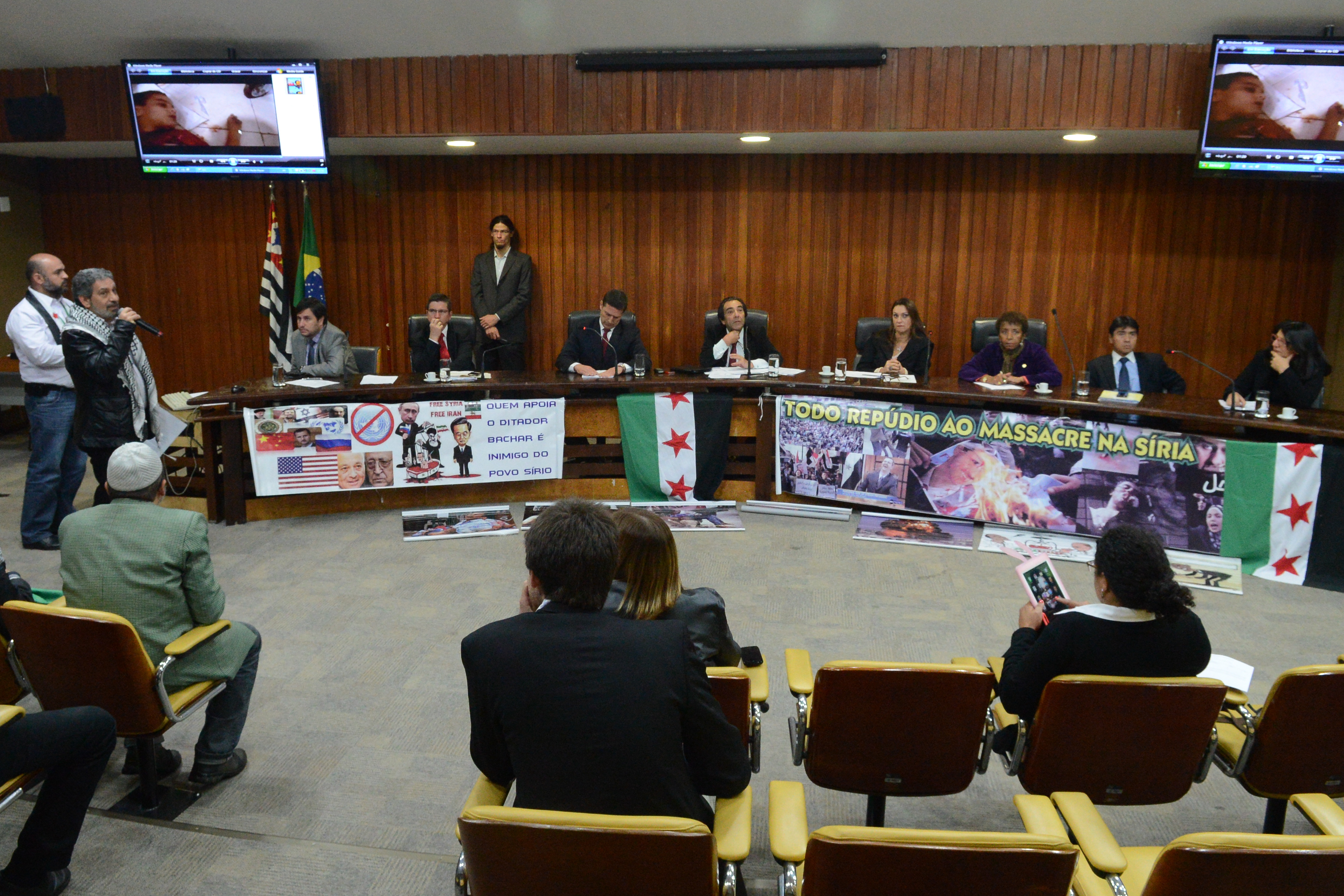 Comunidade siria denuncia na CDH atrocidades cometidas por ditadura, na foto: Mohamad el kadri (microfone), mesa: Andre Soares, Marco Aurelio Souza, Fernando Capez, Adriano Diogo, Rita Passos, Leci Brandao, Helio Nishimoto, Beth Sahao, na reuniao: Ehab al dairi, Amer Masarani, 27/08/2013