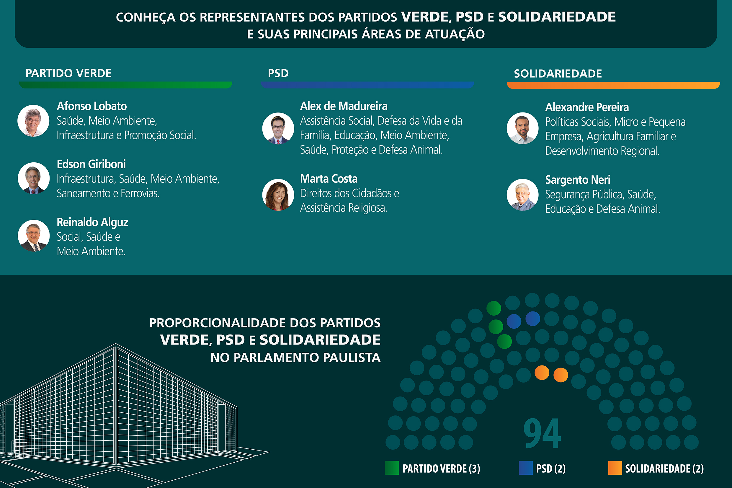 Na segunda reportagem da série especial que retrata a atuação das bancadas partidárias na Assembleia Legislativa do Estado de São Paulo, falaremos sobre os princípios que norteiam o trabalho dos parlamentares que integram os partidos PSD (Partido Social Democrático), PV (Partido Verde) e Solidariedade.