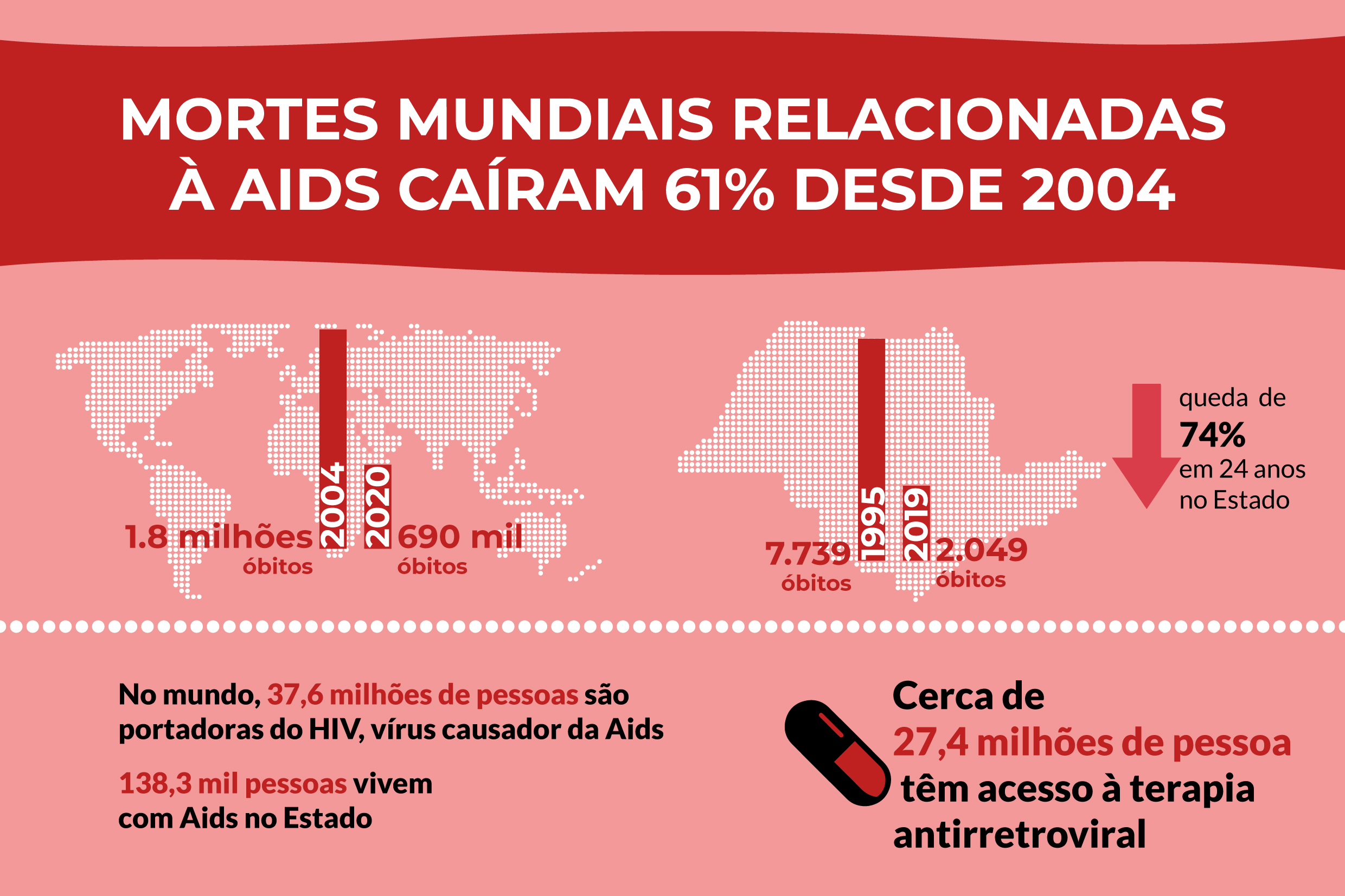 O Estado de São Paulo registrou queda de 74% nas mortes por Aids (Síndrome da Imunodeficiência Adquirida) em 24 anos. Foram 2.049 óbitos em 2019, contra 7.739 em 1995. As mortes mundiais relacionadas à doença também caíram 61% no ano passado em relação às registradas em 2004.