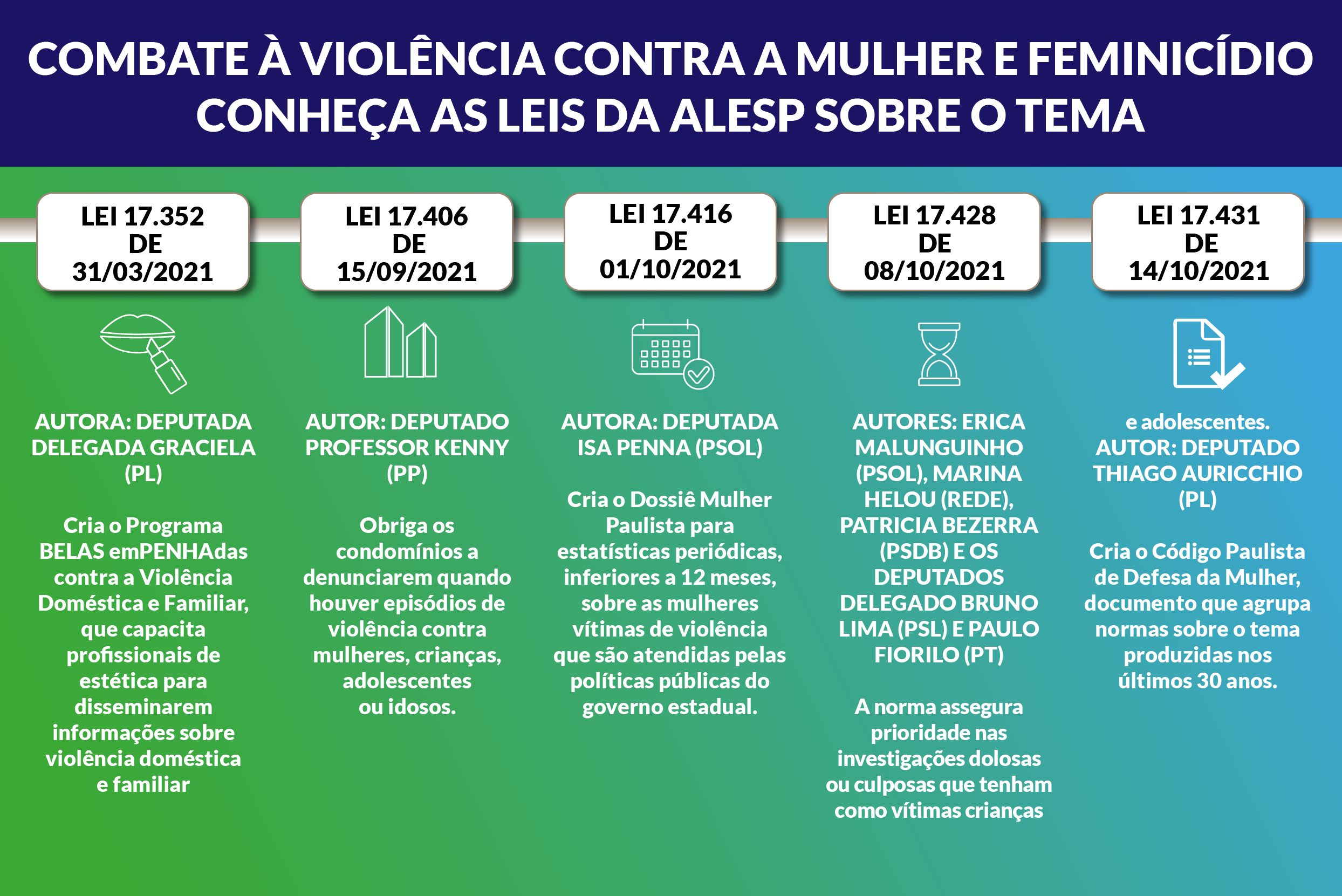Já a Lei 17.239/2020, que cria o Dia Estadual de Prevenção ao Feminicídio, de autoria do ex-deputado Ed Thomas, fala sobre intensificar as informações, debates e mobilizações sobre o combate ao feminicídio, que é o assassinato de mulheres somente por elas serem mulheres, o que reproduz um modelo antigo de que o homem é superior a mulher.