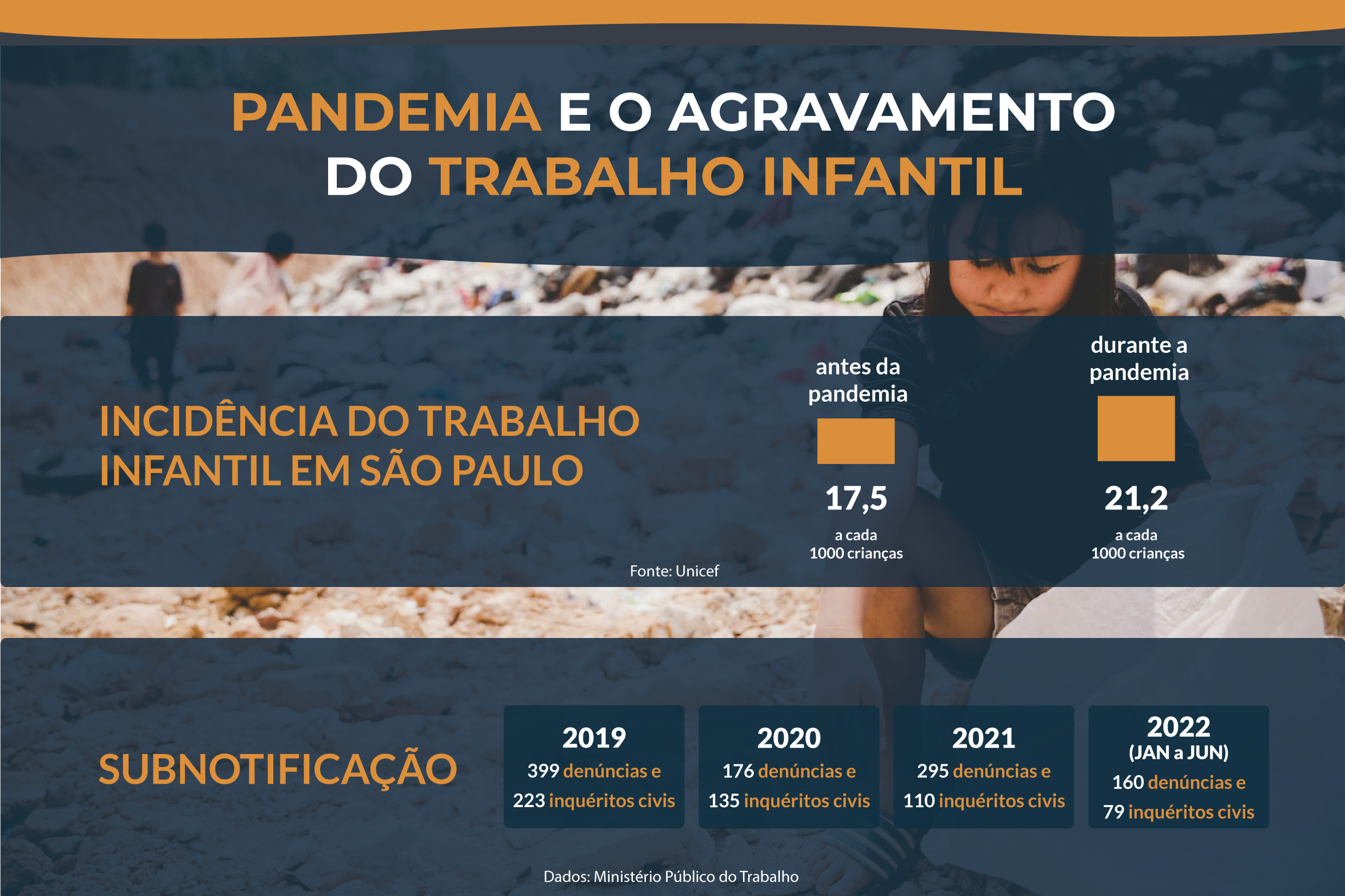 Em São Paulo, o levantamento feito pelo Unicef entre os meses de maio e julho de 2020, apontou o agravamento no trabalho infantil no Estado durante a pandemia. O estudo, realizado com 52.744 famílias em situações de vulnerabilidade social de diversas regiões, identificou um aumento de 26% do trabalho infantil no período.