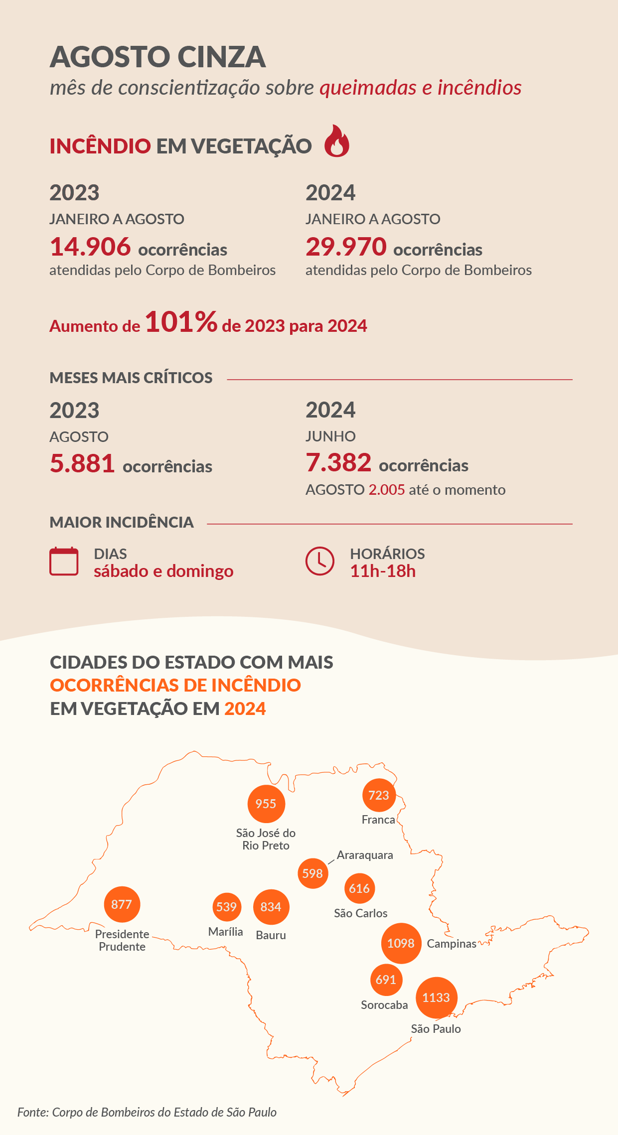 Considerando o aumento de mais de 100% no número de ocorrências de incêndio em vegetação em 2024, em relação a 2023, é cada vez mais necessário trabalhos de conscientização sobre o tema - os dados são do Corpo de Bombeiros do Estado de São Paulo.