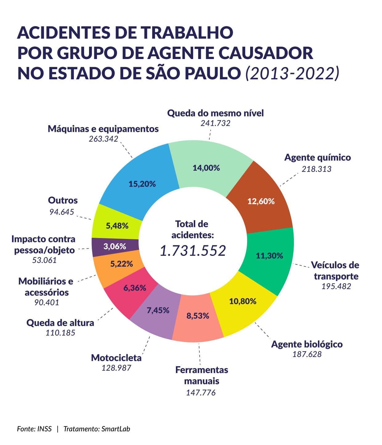 Segundo a plataforma SmartLab, o Estado de São Paulo teve 186 casos de acidentes de trabalho a cada 10 mil trabalhadores em 2022, marca acima da média nacional que é de 171 casos. Já os dados coletados pelo eSocial, novo sistema do Ministério do Trabalho e Emprego, apontam para 373 mortes de trabalhadores no estado em 2023, principalmente na Construção Civil e no Transporte Rodoviário.