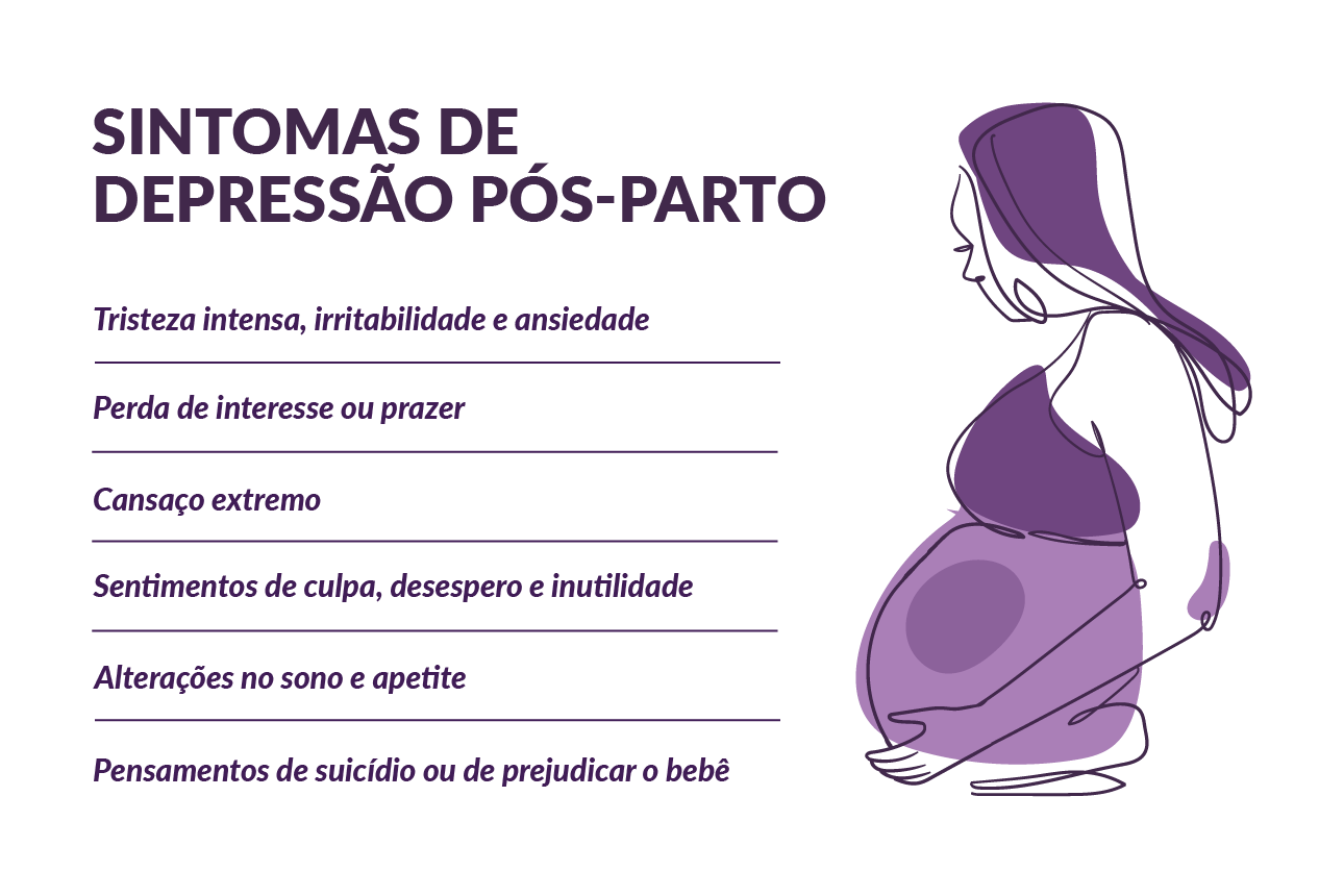 Ela explica que alterações de humor; perda de interesse ou prazer; falta de motivação para cuidar do bebê ou de si mesma; alterações no sono e apetite; cansaço extremo; dificuldade de concentração; perda de memória; sentimentos de inadequação como mãe; e culpa por não conseguir lidar com o bebê ou por não se sentir feliz são os sintomas mais comuns relacionados ao transtorno. "Pensamentos de morte ou de prejudicar o bebê podem ser perigosos e exigem ajuda imediata", alerta a especialista.