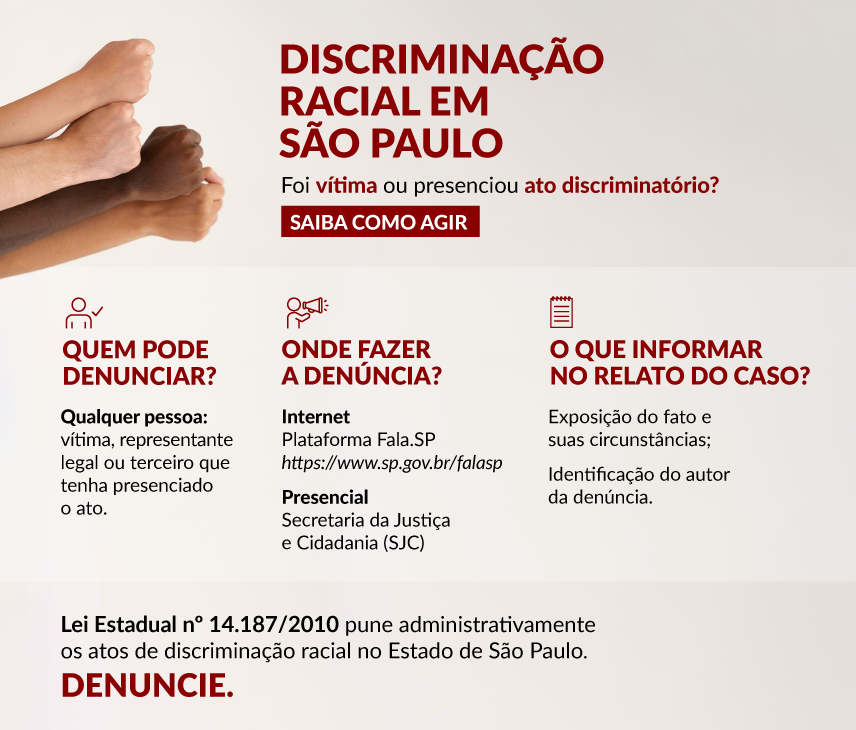 Conforme a Lei 14.187, a denúncia de discriminação racial pode ser registrada pela vítima, seu representante legal ou por "qualquer pessoa que tenha ciência do ato discriminatório". A plataforma Fala.SP é um dos canais mais utilizados para recebimento e encaminhamento das reclamações. O denunciante também pode ir à SJC, que foi transferida para o Palácio dos Campos Elíseos, localizado na Avenida Rio Branco, 1.269, no centro de São Paulo.