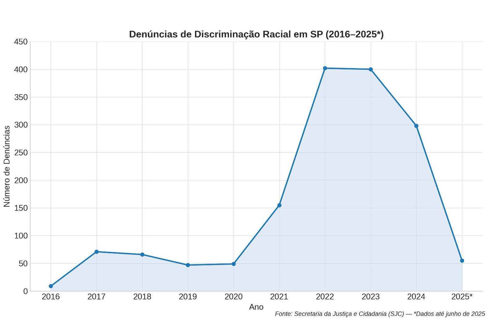 Por meio da Lei 14.187/2010, sancionada há 15 anos, São Paulo tornou-se o primeiro estado brasileiro a punir discriminação racial com sanções administrativas. De janeiro de 2016 a junho de 2025, informa a Secretaria de Justiça e Cidadania (SJC), foram registradas 1.552 denúncias. Dessas ocorrências, resultou a arrecadação de R$ 911.335,86 em multas aplicadas, sem considerar a correção pela inflação do período.