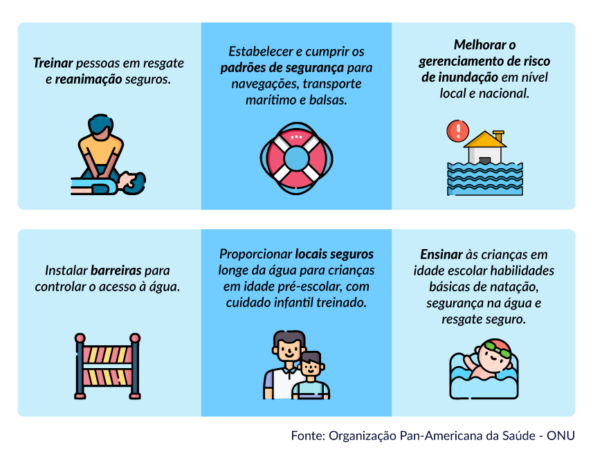 A Opas criou um protocolo com seis intervenções de prevenção de afogamento, que auxiliam a reduzir os riscos de acidentes: