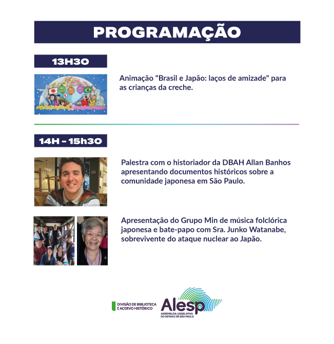 O tema deste segundo encontro é a cultura japonesa. Os participantes terão a oportunidade de conhecer documentos históricos do acervo da Alesp que registram a presença da comunidade japonesa no Brasil, assistir à apresentação do grupo Min, que toca música folclórica japonesa, e participar de um bate-papo especial com a Sra. Junko Watanabe, sobrevivente do ataque nuclear ao Japão e ativista pela paz.