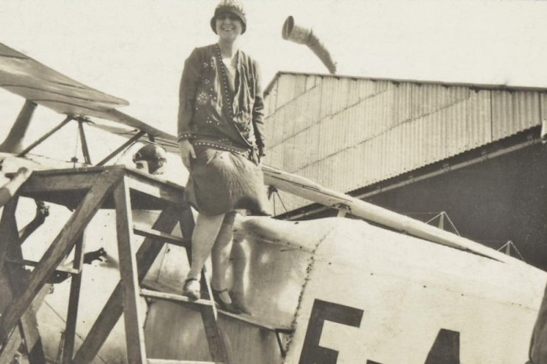 Bertha Lutz ao lado do avião utilizado para distribuir panfletos em Natal-RN