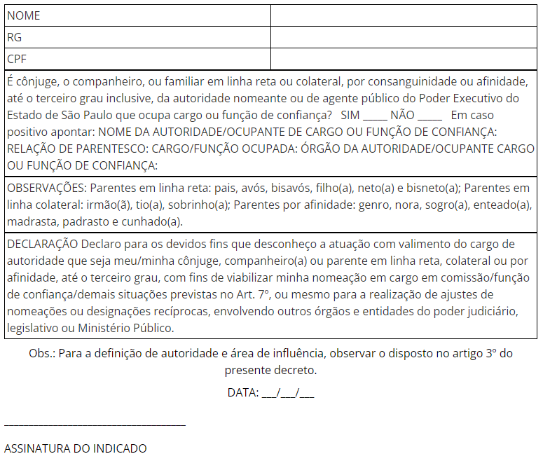 V - inserir nos processos e expedientes destinados à nomeação, no âmbito da administração direta e das autarquias, para o exercício de cargo em comissão, emprego público ou função de confiança, declaração de parentesco do interessado, conforme ANEXO.