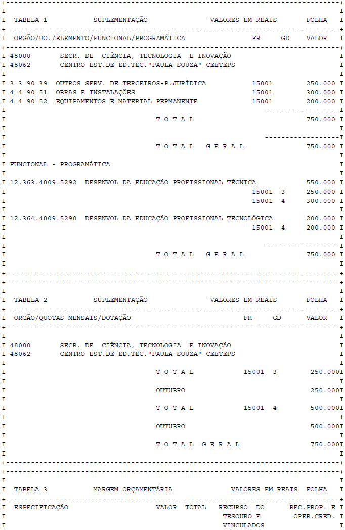 Artigo 1° - Fica aberto um crédito de R$ 750.000,00 (setecentos e cinquenta mil reais), suplementar ao orçamento da Centro Estatual de Educação Tecnológica Paula Souza - CEETEPS, observando-se as classificações Institucional, Econômica, Funcional e Programática, conforme a Tabela 1, anexa.