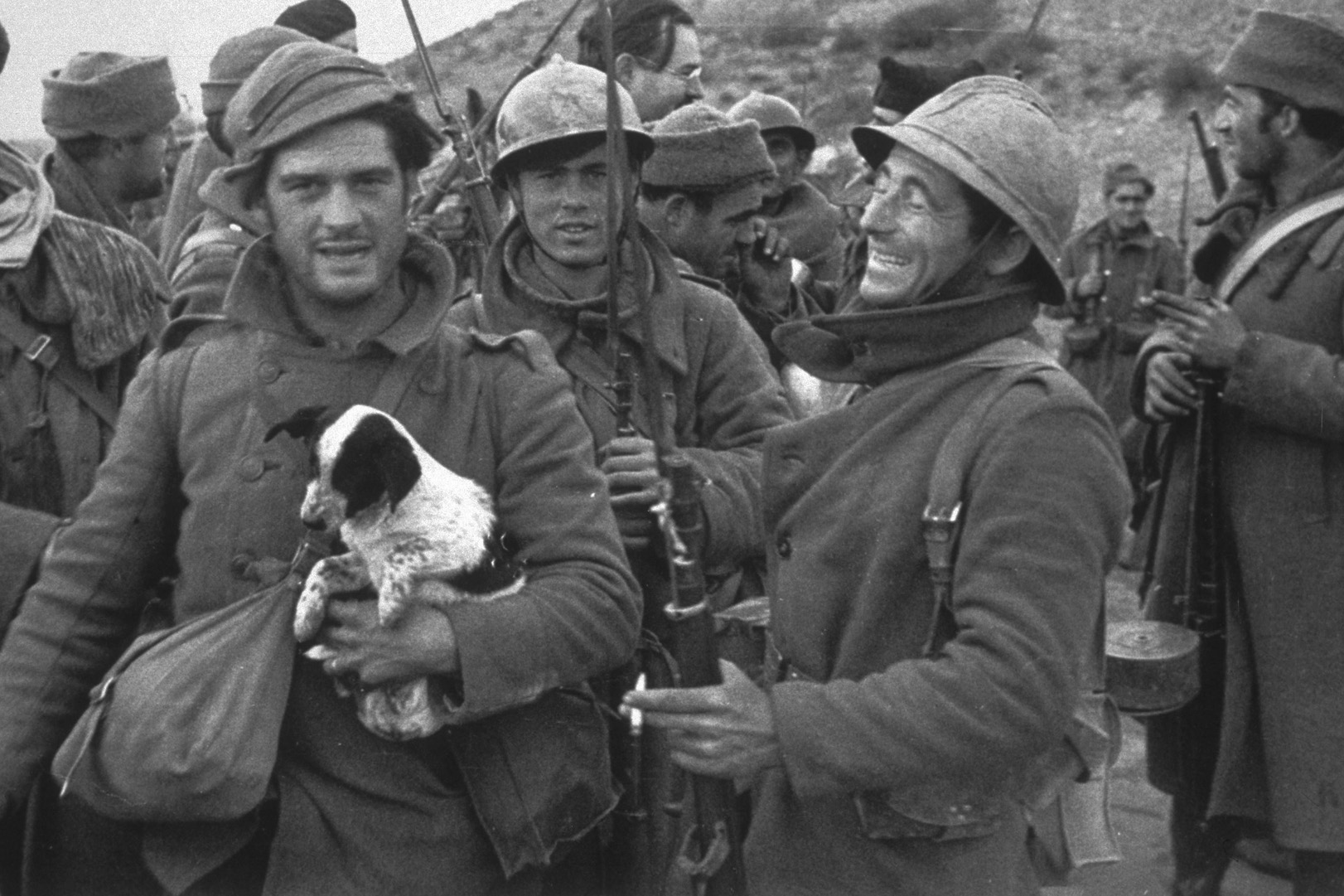 Foto retrata momento de descontração na Guerra Civil Espanhola em 1937, o escritor George Orwell segura um cão e Ernest Hemingway pode ser visto no plano de fundo