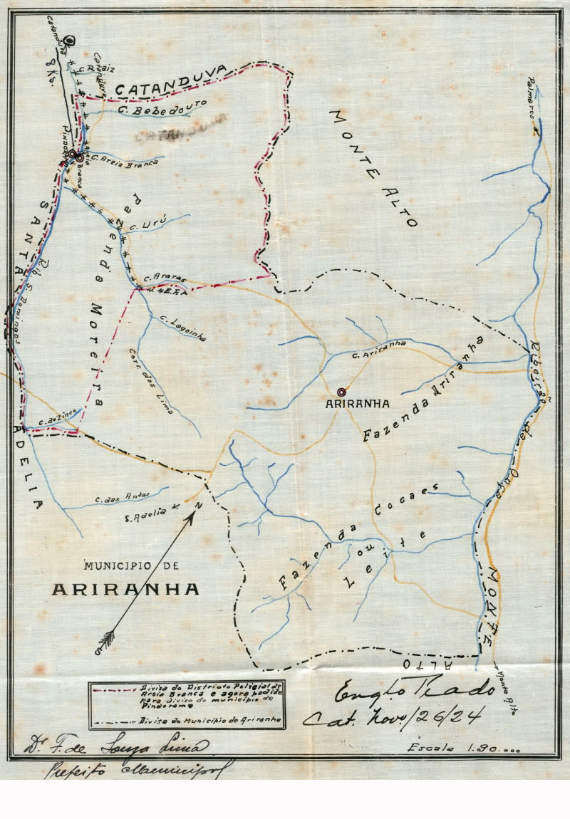 De um lado estava o núcleo de Areia Branca. Com dois mil habitantes, era distrito policial do Município de Ariranha. Possuía um centro comercial, um cinema e um majestoso campo de futebol. Na outra margem do riacho estava o Distrito de Pindorama, uma colônia de lavradores estabelecida em 1907, que pertencia ao Município de Santa Adélia. Bem maior, contava com quase dez mil habitantes e tinha uma escola. Os dois distritos eram interligados por uma ponte, retratada em uma das fotos.