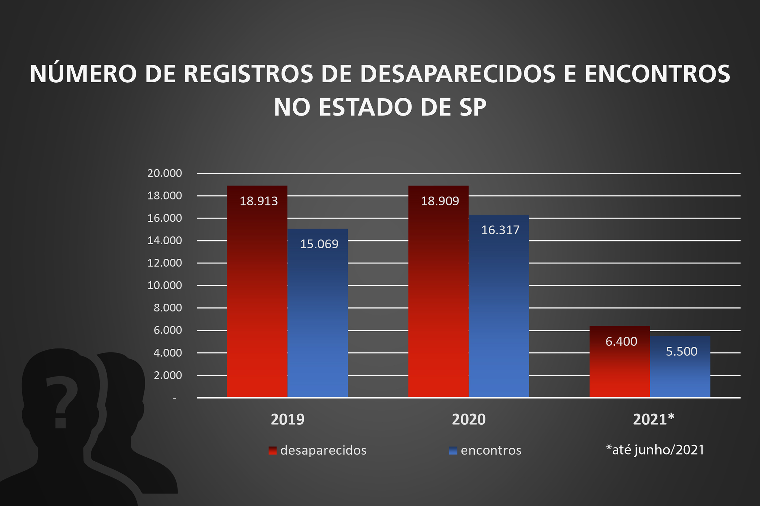 Segundo informações da secretaria, há atualmente 1.315 pessoas no banco de desaparecidos, entre elas, homens, mulheres e crianças. De acordo com dados do governo federal, somente em território paulista, no ano passado, foram registrados 18.909 desaparecimentos e 16.317 encontros de pessoas. Em 2019, foram 18.913 e 15.069, respectivamente. Neste ano, até o momento, foram mais de 6,4 mil desaparecimentos e 5,5 mil encontros.