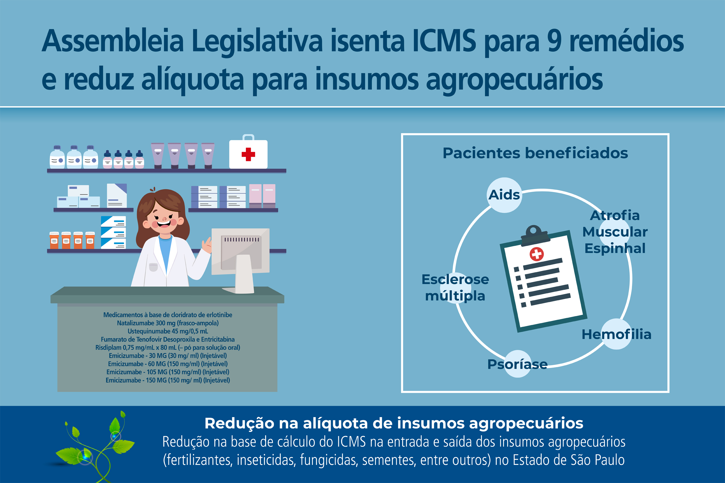 Os deputados e deputadas da Assembleia Legislativa do Estado de São Paulo autorizaram nesta terça-feira (3/8) a isenção de ICMS (Imposto sobre a Circulação de Mercadorias e Serviços) sobre, ao menos, nove medicamentos destinados ao tratamento da Aids, AME (atrofia muscular espinhal), esclerose múltipla, hemofilia e outras doenças genéticas.