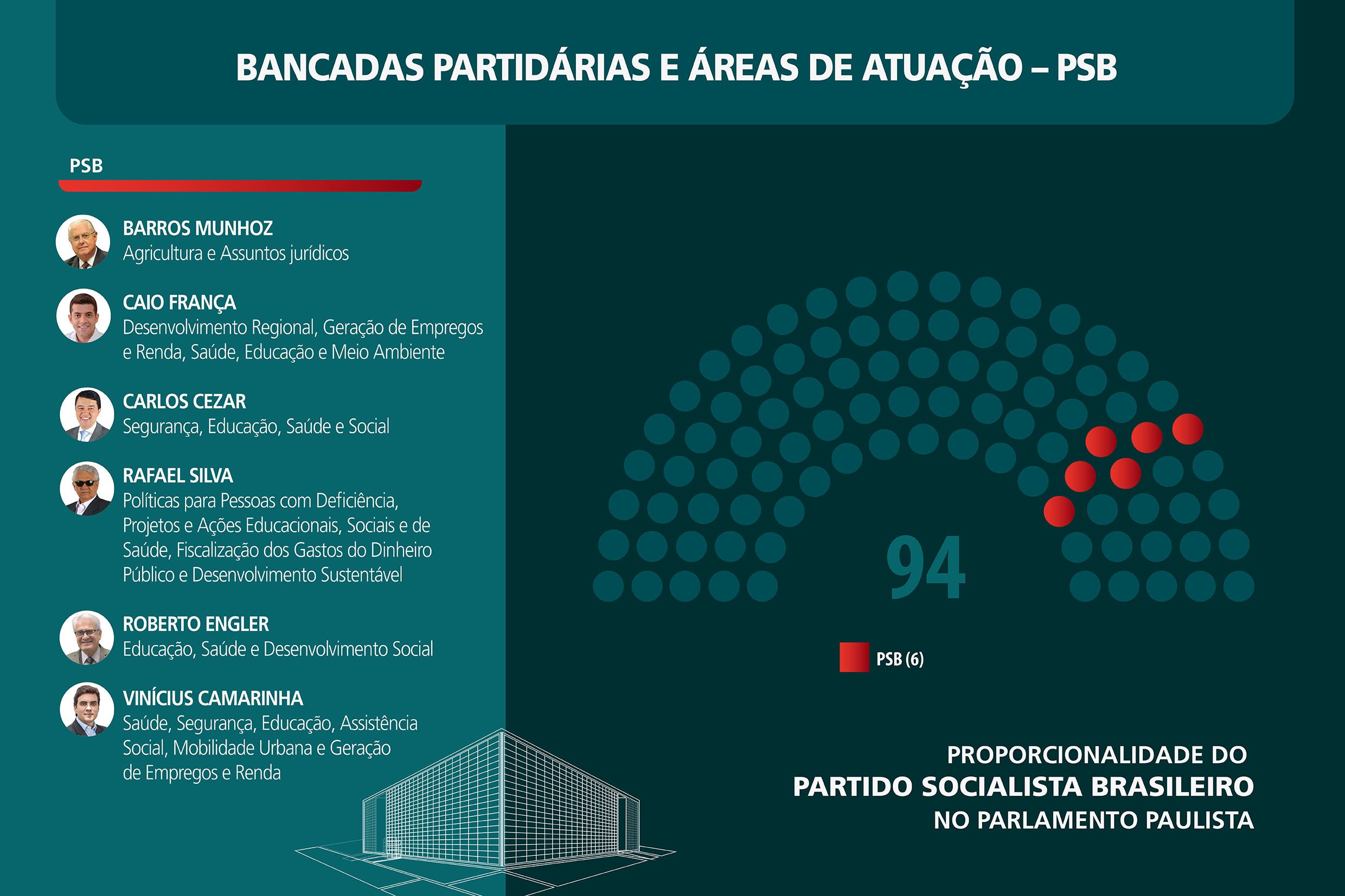 O PSB tem nos deputados estaduais Barros Munhoz, Caio França, Carlos Cezar, Rafael Silva, Roberto Engler e Vinícius Camarinha seus porta-vozes para a população do Estado de São Paulo.