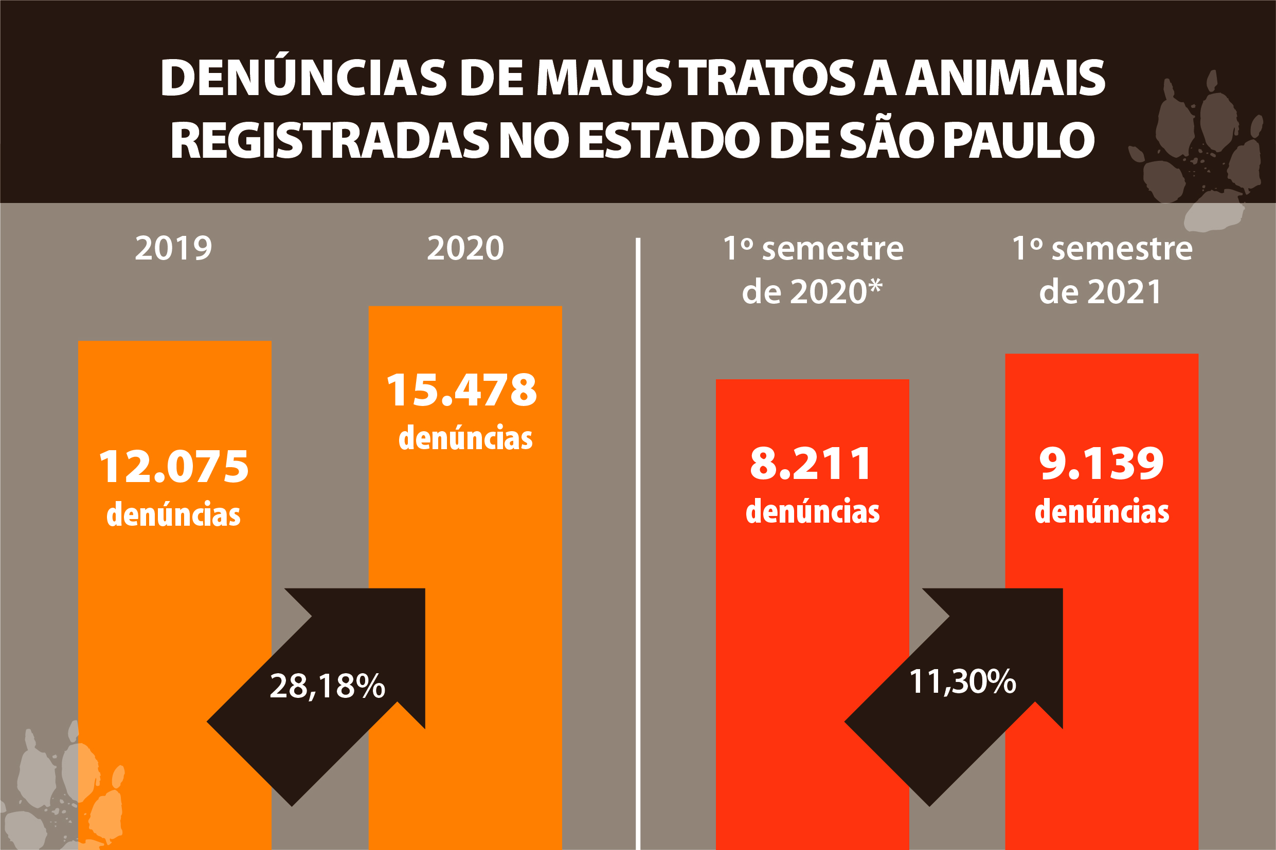 De acordo com dados fornecidos pela Secretaria de Segurança Pública do Estado, em todo o ano de 2019, foram registradas 12.075 denúncias de maus tratos a animais, enquanto que em 2020, foram 15.478 denúncias, um aumento de 28,18%. No primeiro semestre de 2020, o número de queixas foi de 8211, um crescimento de 11,30% comparado às 9139 denúncias apresentadas nos seis primeiros meses de 2021.