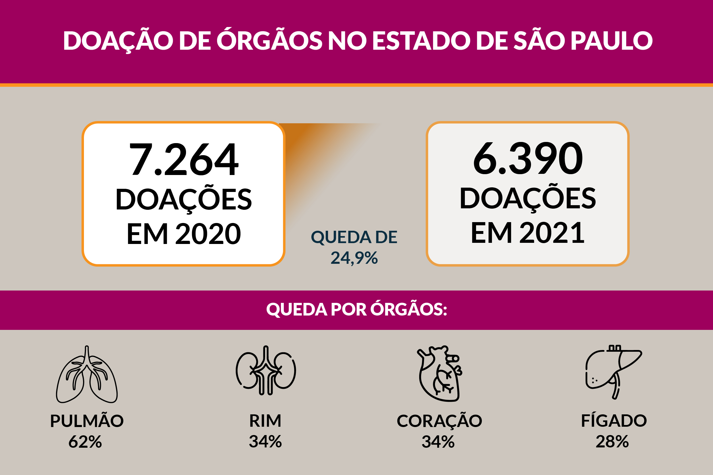 No primeiro semestre de 2021, foram contabilizadas 6.390 doações de órgãos de pessoas vivas ou falecidas. No mesmo período do ano passado, cerca de 7.264 foram realizadas, o que significa 24,9% a menos em relação ao ano anterior. Alguns dos procedimentos mais prejudicados foram pulmão, com 62%, seguido de rim 34%, coração 34% e fígado, com 28%.