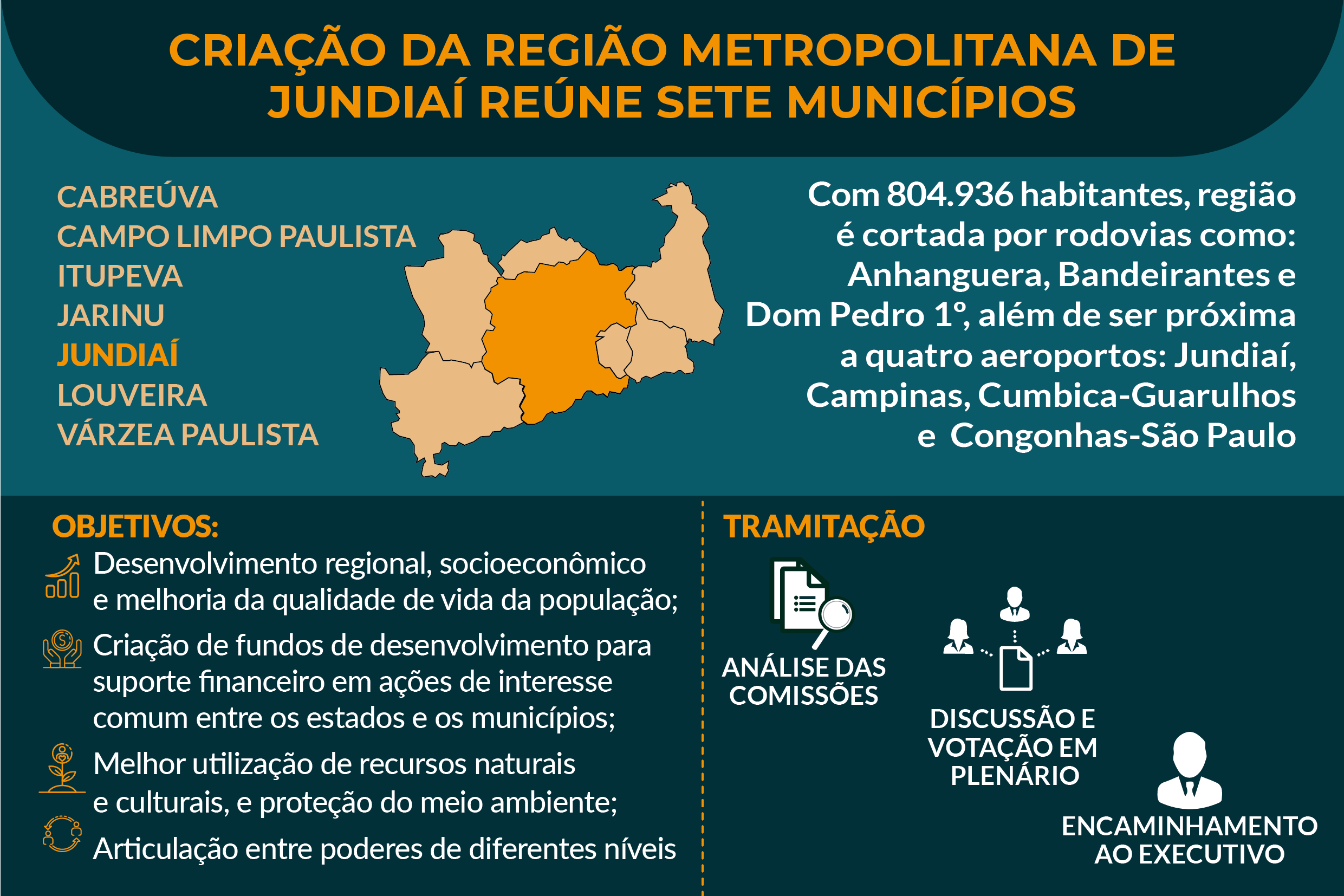 A Assembleia Legislativa do Estado de São Paulo já iniciou as discussões sobre o Projeto de Lei Complementar 36/21, que cria a Região Metropolitana de Jundiaí. A nova região metropolitana paulista -a nona, no total- será formada pelos municípios de Jundiaí, Cabreúva, Campo Limpo Paulista, Itupeva, Jarinu, Louveira e Várzea Paulista e deve ser votada ainda no mês de novembro pelos deputados e deputadas do Parlamento.