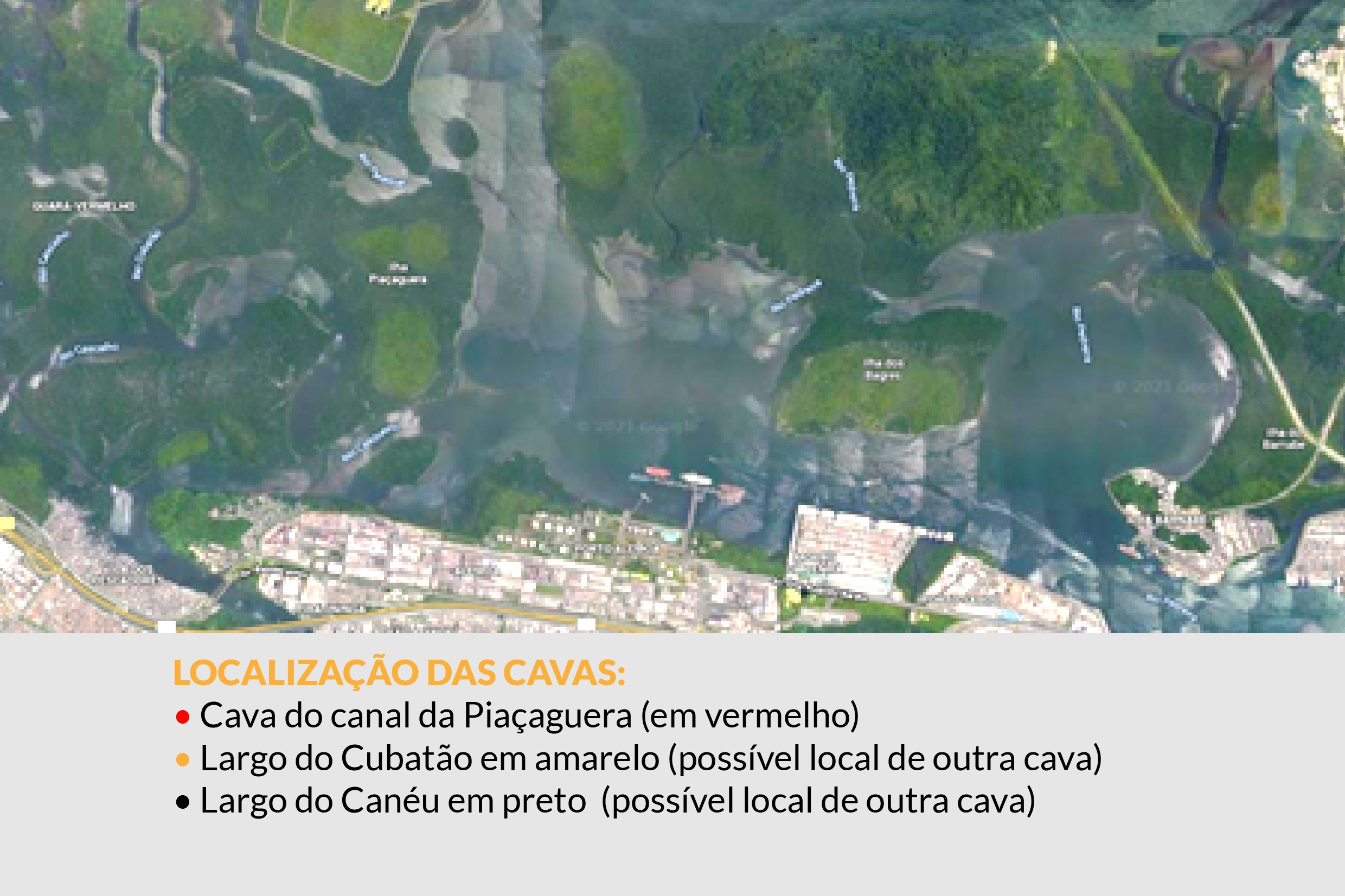 Cava subaquática é uma cratera aberta debaixo da água para despejo de sedimentos, lixo e materiais contaminados. A cava feita no estuário entre Santos e Cubatão é maior que o estádio do Maracanã, com dimensões de 400 metros de diâmetro por 25 metros de profundidade, e está preenchida por cerca de 2,4 bilhões de litros de sedimentos.