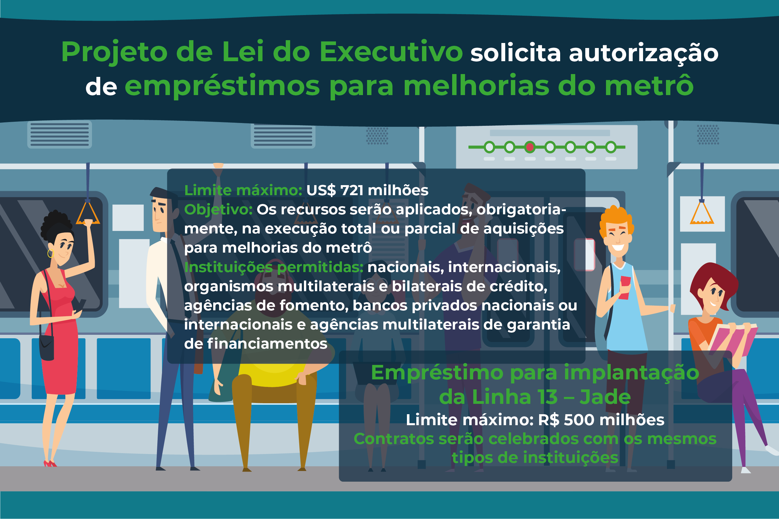 A proposição solicita uma autorização para a celebração de empréstimos com instituições nacionais ou internacionais, organismos multilaterais e bilaterais de crédito, agências de fomento, bancos privados nacionais ou internacionais e agências multilaterais de garantia de financiamentos, com um limite máximo de valor de US$ 721 milhões. Segundo o documento, os recursos serão aplicados, obrigatoriamente, na execução total ou parcial de aquisições para melhorias do metrô.