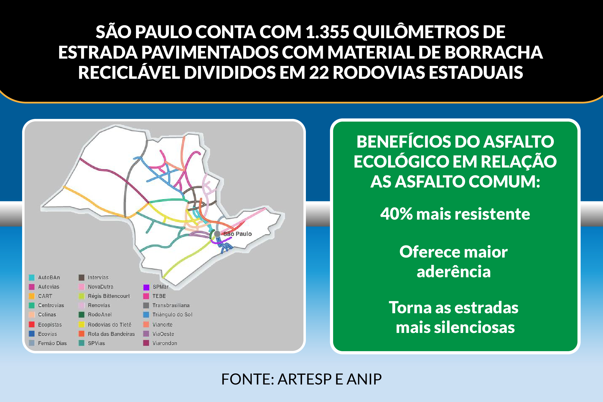 Segundo levantamento realizado pela Artesp (Agência Reguladora de Transporte do Estado de São Paulo) em 2021, São Paulo conta com mais de 1.355 quilômetros pavimentados com material de borracha reciclável divididos em 22 rodovias estaduais, com destaque para a Rodovia dos Bandeirantes e para o sistema Anchieta-Imigrantes.
