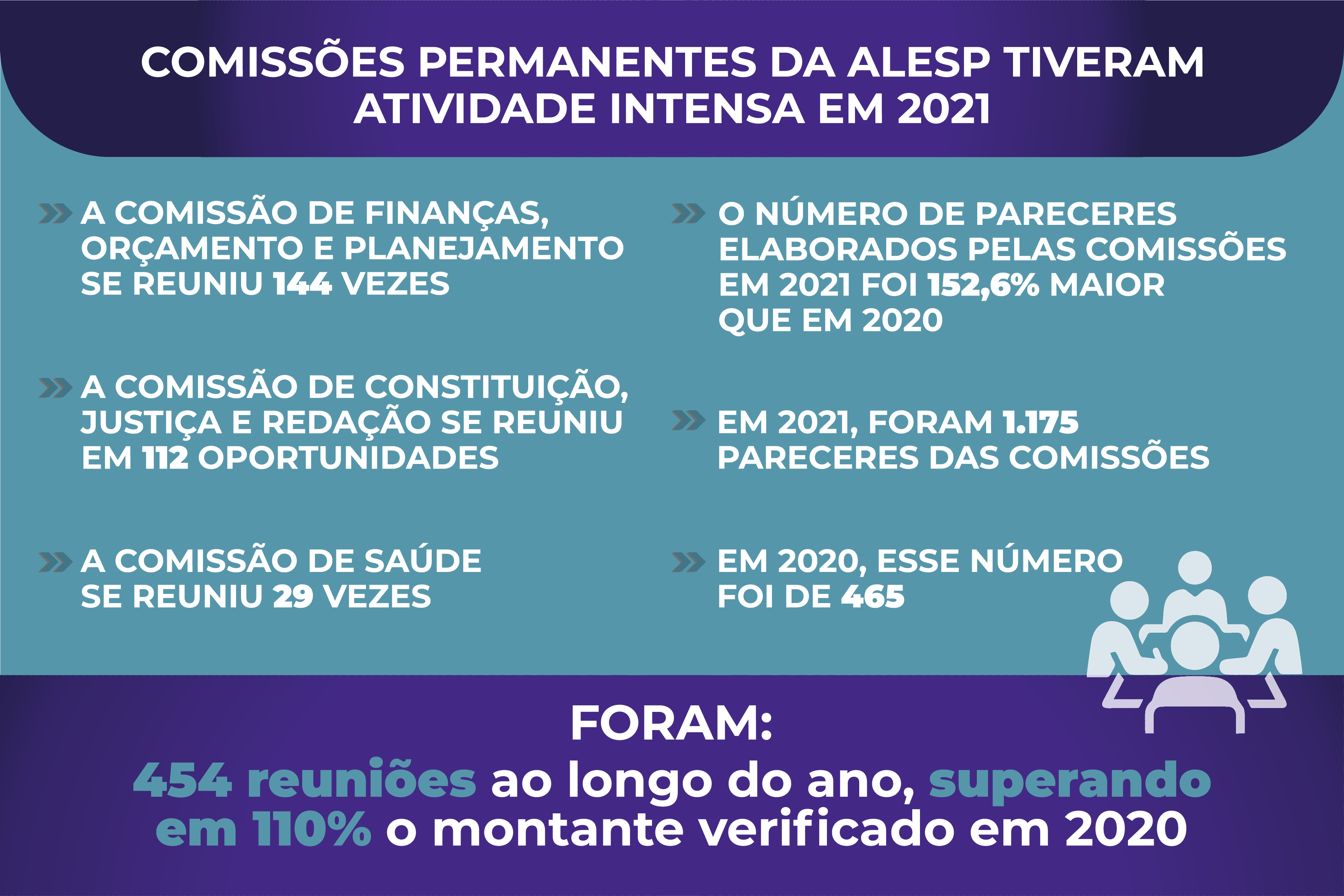 Nas comissões permanentes, foram realizadas 110% reuniões a mais que em 2020. Ao todo, foram 454 encontros em 2021, ante 216 em 2020. As comissões permanentes da Assembleia Legislativa paulista são órgãos técnicos compostos por grupos de 11 ou 13 deputados indicados para compô-las, por períodos de dois anos, e têm o dever de discutir e apreciar projetos de lei, emendas e outras proposições, isso antes da discussão e votação em Plenário.