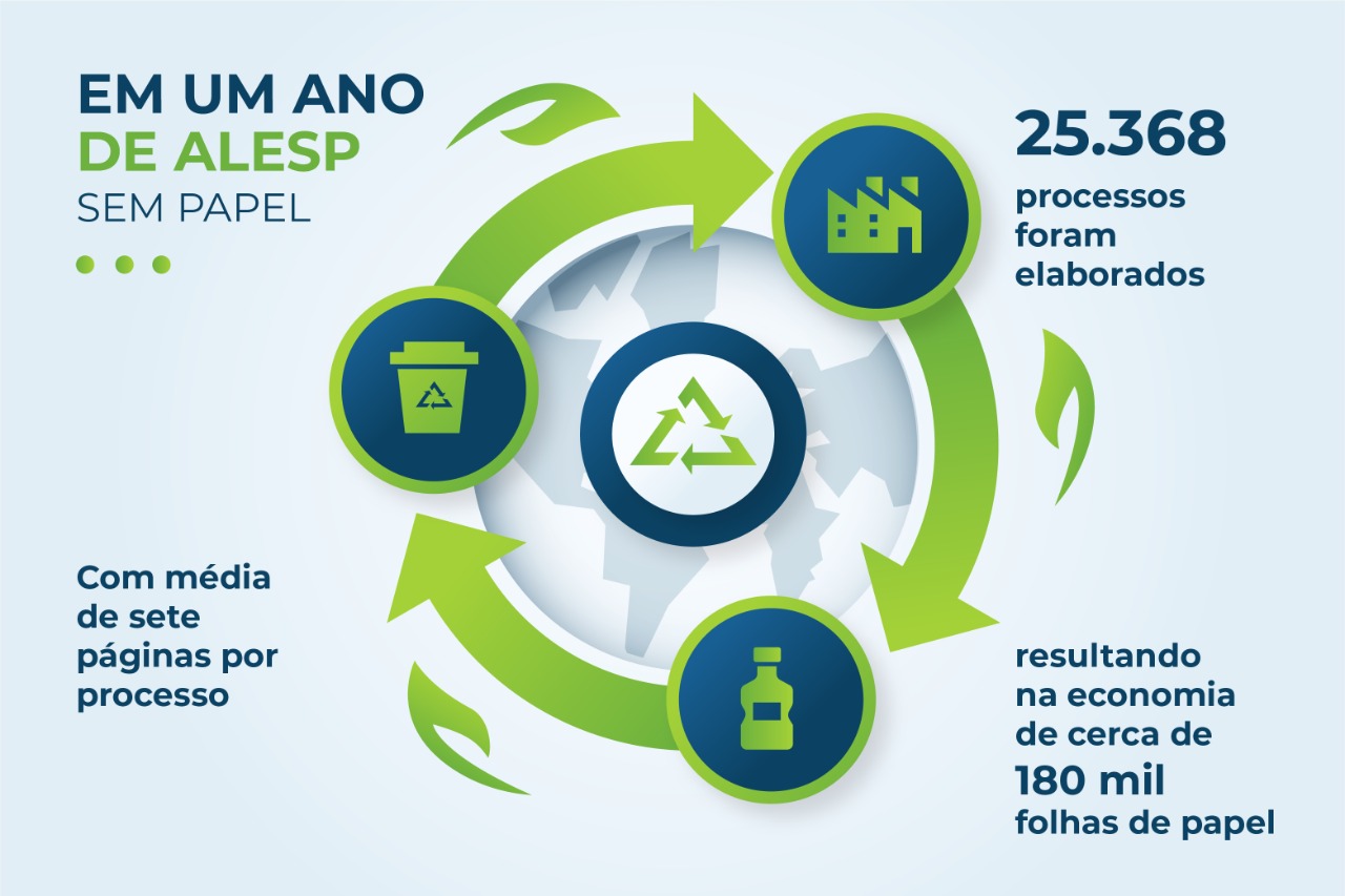 Criado em 2019, o Alesp Sem Papel nasceu com os objetivos de diminuir a quantidade de circulação de papel e os custos, e promover a praticidade. Em apenas um ano, 25.368 processos já foram elaborados no novo sistema eletrônico, o que representa a economia alcançada. Na natureza, inúmeros litros de água e 18 árvores foram poupadas com a iniciativa da Alesp.
