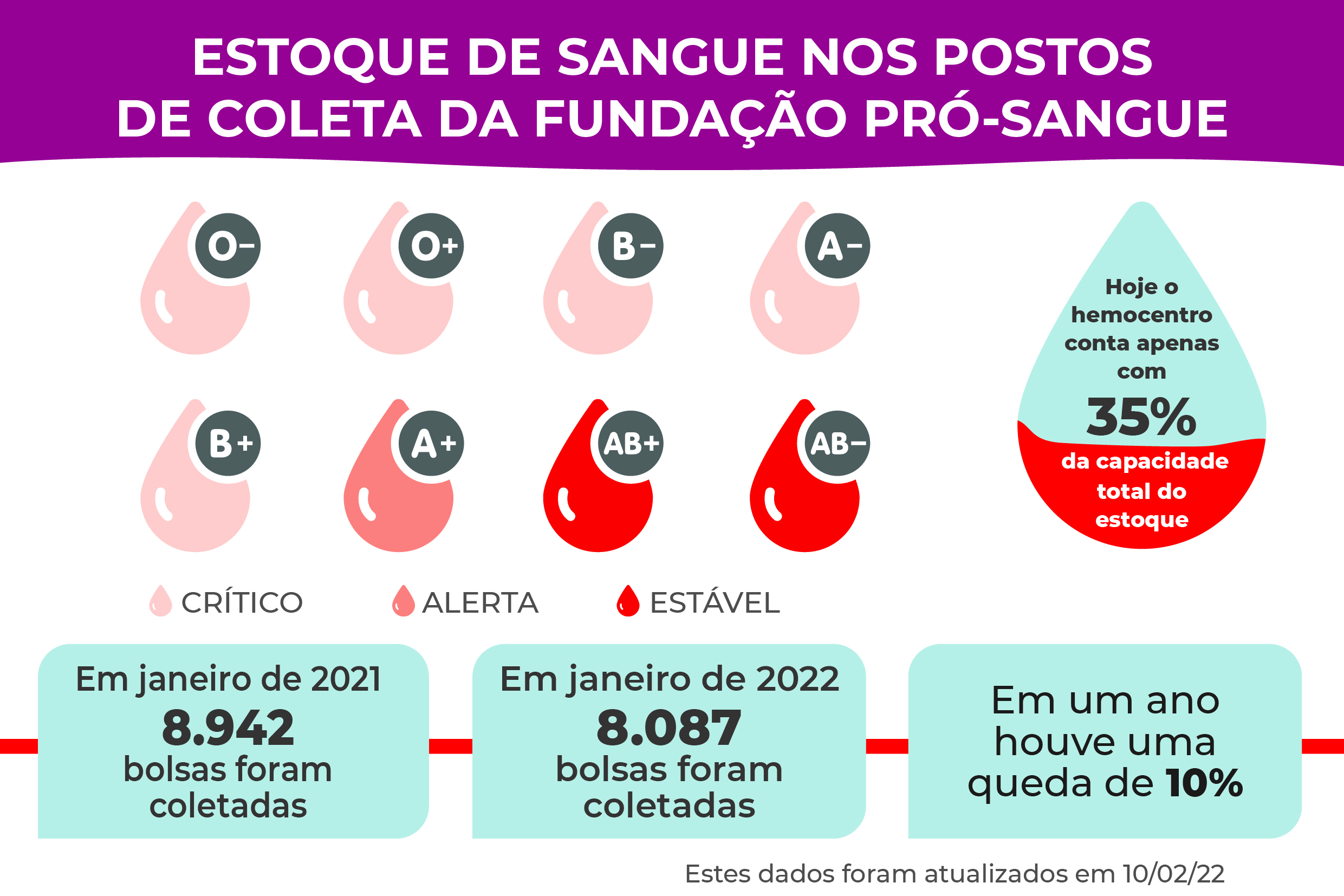 A instituição também registrou queda de 10% no número de doações no mês de janeiro em comparação ao ano passado. Em 2021, 8.942 bolsas foram coletadas, enquanto em 2022, apenas 8.087.