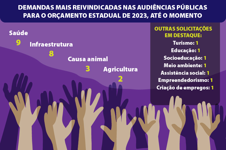 Melhorias e investimentos nas áreas da saúde e de infraestrutura, seja urbana ou rural, foram as principais demandas apresentadas até agora pela população paulista nas audiências públicas para o Orçamento Estadual de 2023. Ao todo, 15 municípios já foram visitados pelos parlamentares da Assembleia Legislativa do Estado de São Paulo. A estimativa é que até o dia 30 de maio, outras 14 cidades, incluindo a Capital, recebam o evento.
