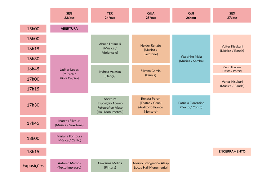 Ao longo da semana, estão previstas apresentações de números musicais, de dança, teatro, pintura, fotografia, leitura de contos e poesias, além de mostras de textos impressos e shows de stand-up comedy. Confira a programação: