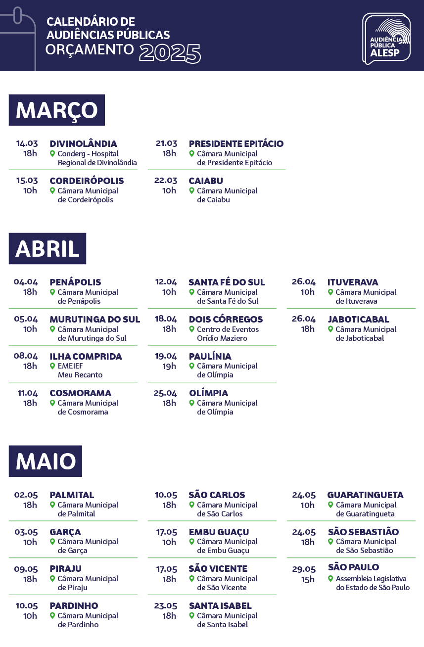 Entre os meses de março e maio, os integrantes da Comissão de Finanças da Casa viajarão 25 cidades paulistas de diferentes regiões do Estado. Seguindo o compromisso de contemplar a população de novos municípios a cada ano, a construção do calendário priorizou cidades que nunca receberam as audiências.