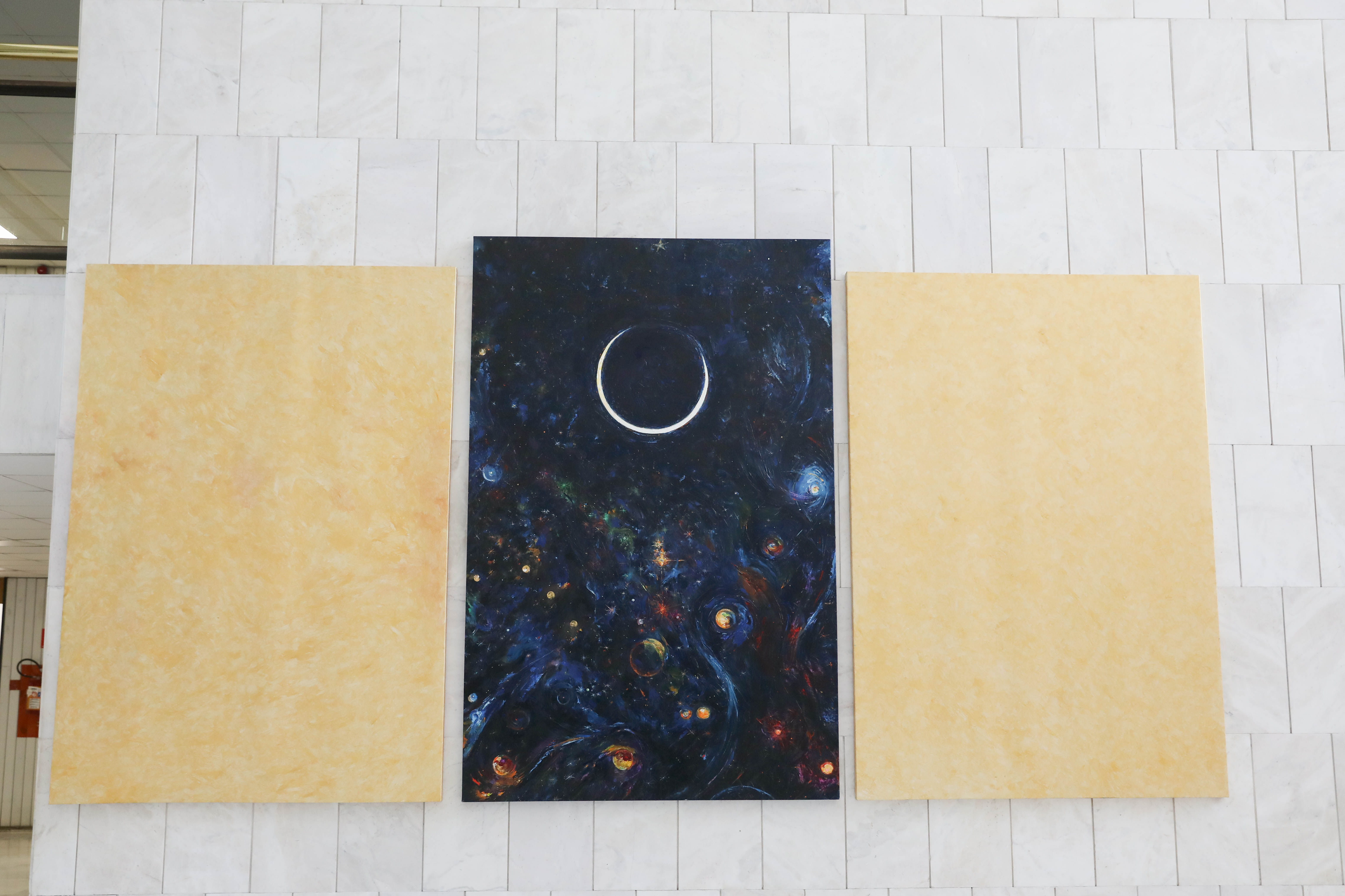 Já na imagem central da obra tripla, o pintor optou por destacar a lua nova, como forma de simbolizar a força do conceito de recomeço, além de outros elementos subliminares na figura. "A estrela de cinco pontas representa proteção espiritual, que traz energia, força, saúde e conhecimento. Também estão subentendidos os elementos da água, fogo, ar e terra como partes intrínsecas às necessidades e origens da humanidade", destaca.