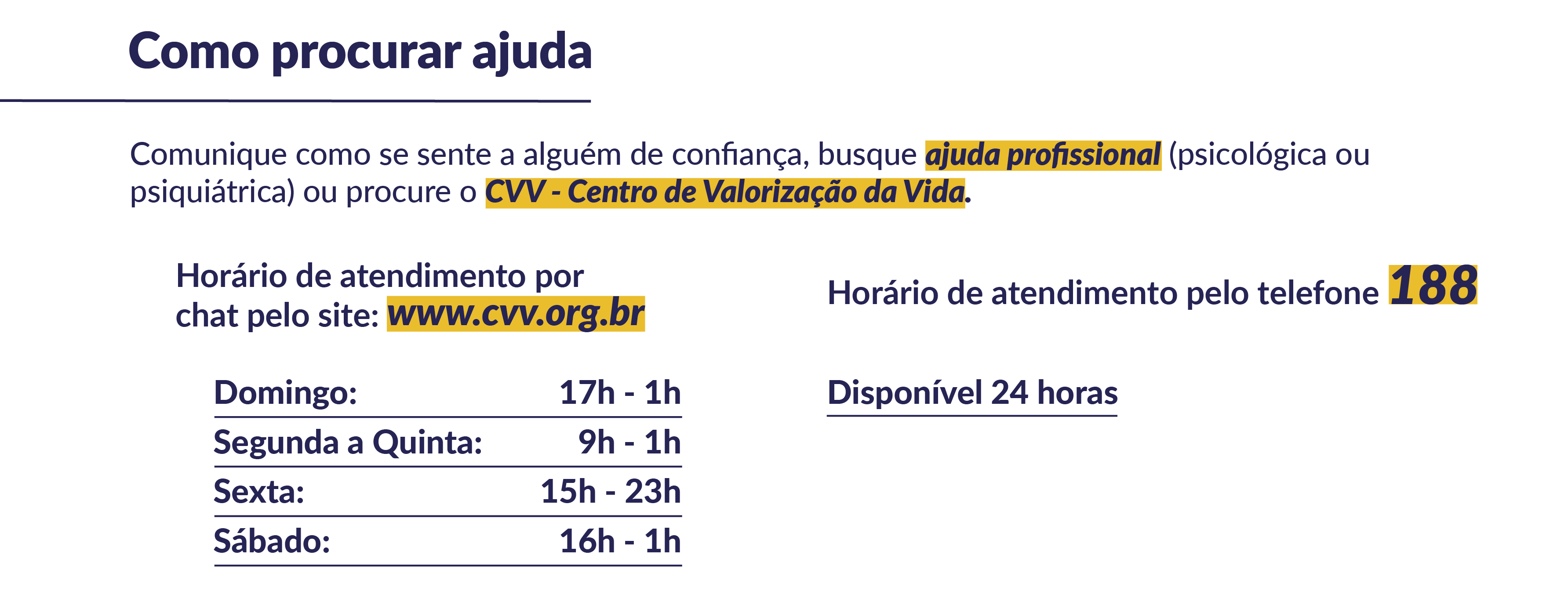 Fundado em São Paulo em 1962, o CVV (Centro de Valorização da Vida) é um serviço voluntário gratuito de apoio emocional e prevenção ao suicídio para todas as pessoas que precisam conversar, sob total sigilo e anonimato. O canal oferece atendimento pelo telefone 188 (24 horas e sem custo de ligação), por chat, e-mail ou pessoalmente.