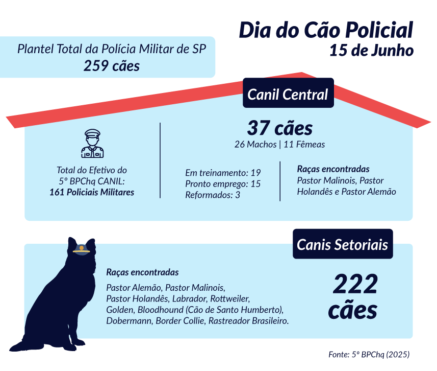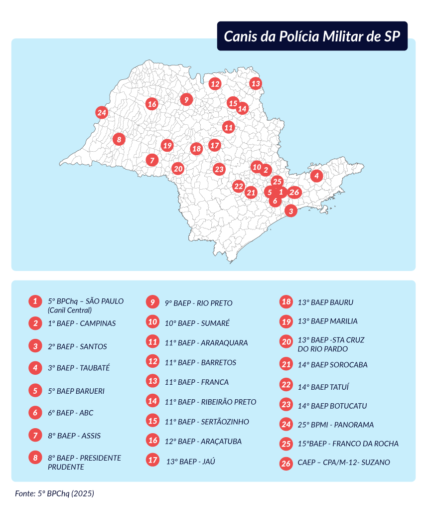 Na Polícia Militar, o trabalho com cães é ainda mais amplo. Segundo o capitão Herick Lemos, chefe da comunicação social do 5º Batalhão de Polícia de Choque - Canil Central -, atualmente o estado de São Paulo conta com 26 canis da PM, sendo um central em São Paulo (Zona Norte) e outros 25 distribuídos em diferentes regiões do estado.