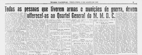 Jornal reforça necessidade de envio de armamentos para soldados do front/Diário Nacional 9/8/1932