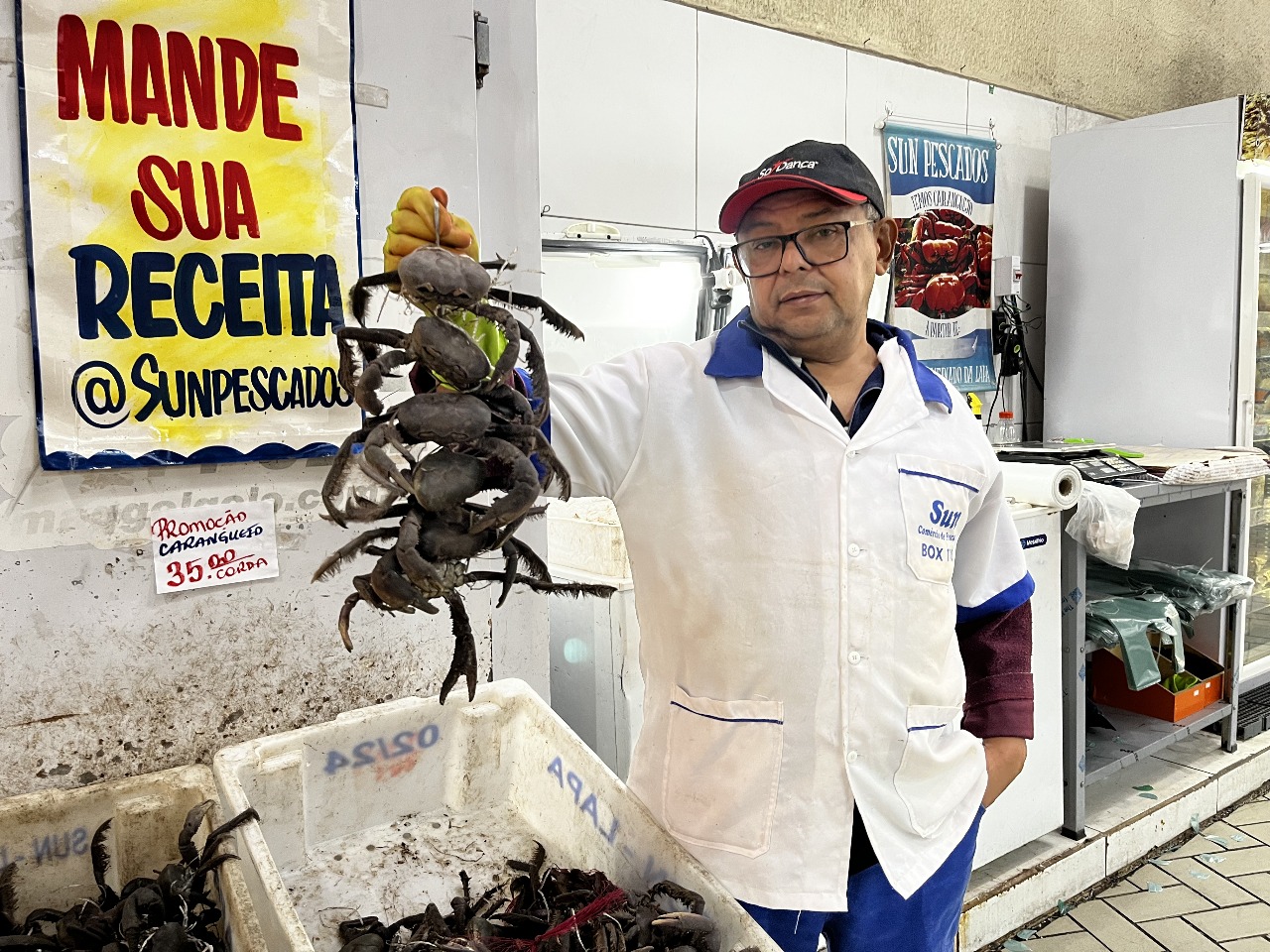 Comerciante Édson da Silva Oliveira, seu box é um dos poucos que vende frutos do mar; com destaque para os caranguejos vivos.