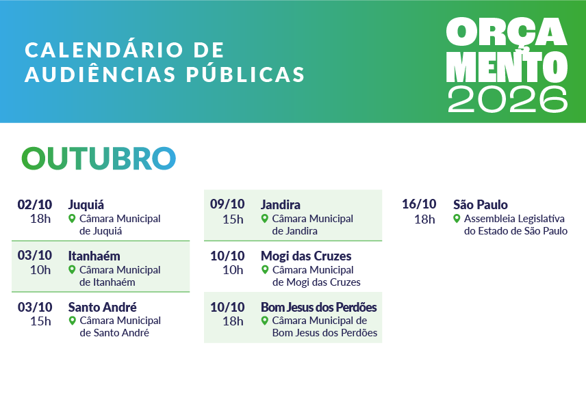 As cidades de Jandira, Mogi das Cruzes e Bom Jesus dos Perdões recebem nesta semana as audiências públicas que vão debater o Orçamento estadual para o ano de 2026. Os encontros são promovidos pela Comissão de Finanças, Orçamento e Planejamento (CFOP) da Assembleia Legislativa do Estado de São Paulo.