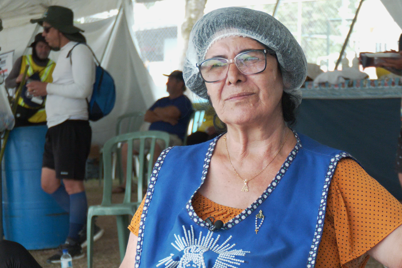 A estrutura improvisada virou ponto de parada para muitos grupos. Café, bolacha, batata-doce e palavras de apoio ajudam a renovar as forças de quem segue rumo à Padroeira.