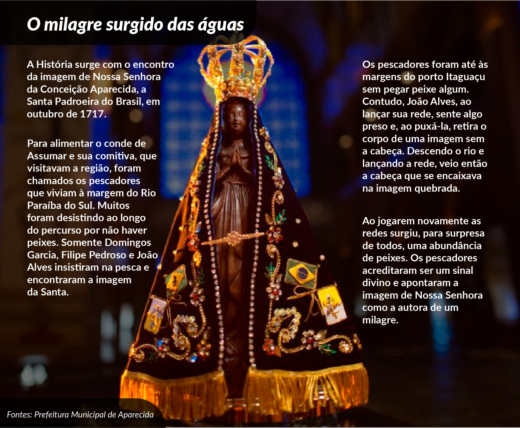 Rodrigo Alvarez é um jornalista e escritor que escreveu a popular biografia "Aparecida", um livro de história que detalha a trajetória da santa e o simbolismo de sua imagem para o Brasil. Além de ser conhecido por sua carreira como repórter e correspondente internacional, Alvarez pesquisou profundamente o tema por anos, reunindo relatos e documentos. O livro cobre mais de três séculos de história, incluindo eventos como o atentado à imagem e a sua reconstrução, a relação da santa com a política e as histórias de fé e milagres atribuídos a ela.