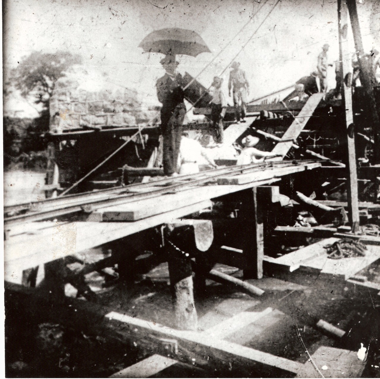 Foto: Euclides da Cunha (no centro da imagem), durante obras de reconstrução da ponte metálica em São José do Rio Pardo (Foto: Acervo da Casa de Cultura Euclides da Cunha)