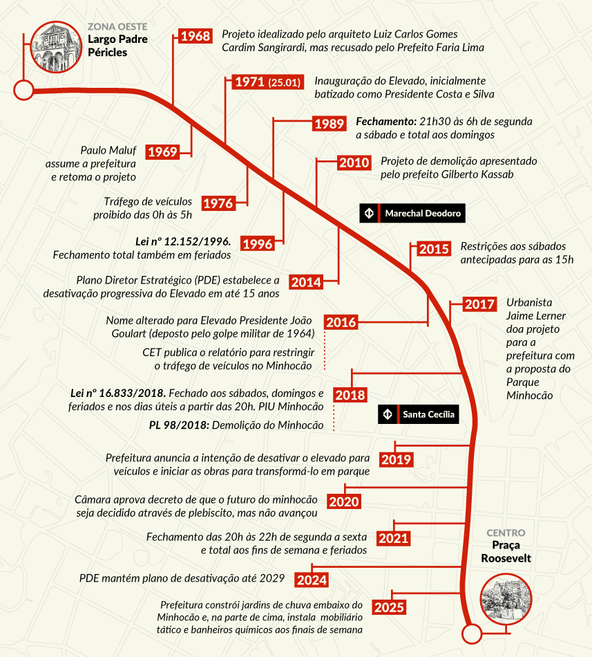Um viaduto que, para muitas pessoas, é a cara de São Paulo: grande, barulhento, cinza, muitas vezes travado, mas, rico em diversidade e cultura. O Elevado Presidente João Goulart, popularmente conhecido como Minhocão, foi inaugurado em 25 de janeiro de 1971, no aniversário da cidade de São Paulo, e já nasceu controverso e polêmico.