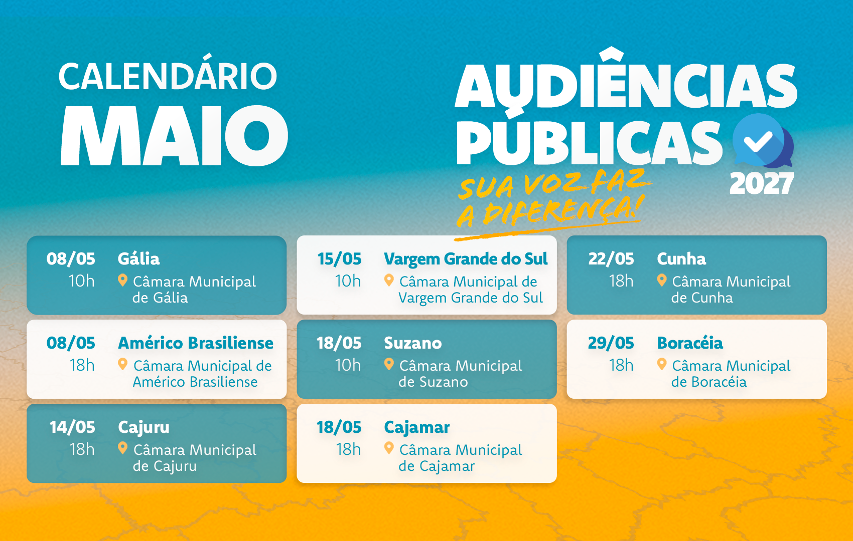 O ciclo de encontros fora da capital terá início no município de Igarapava, no dia 9 de abril, e termina em Boracéia, no dia 29 de maio. Como é tradição, a última data será uma audiência na Alesp, com data ainda a ser divulgada.