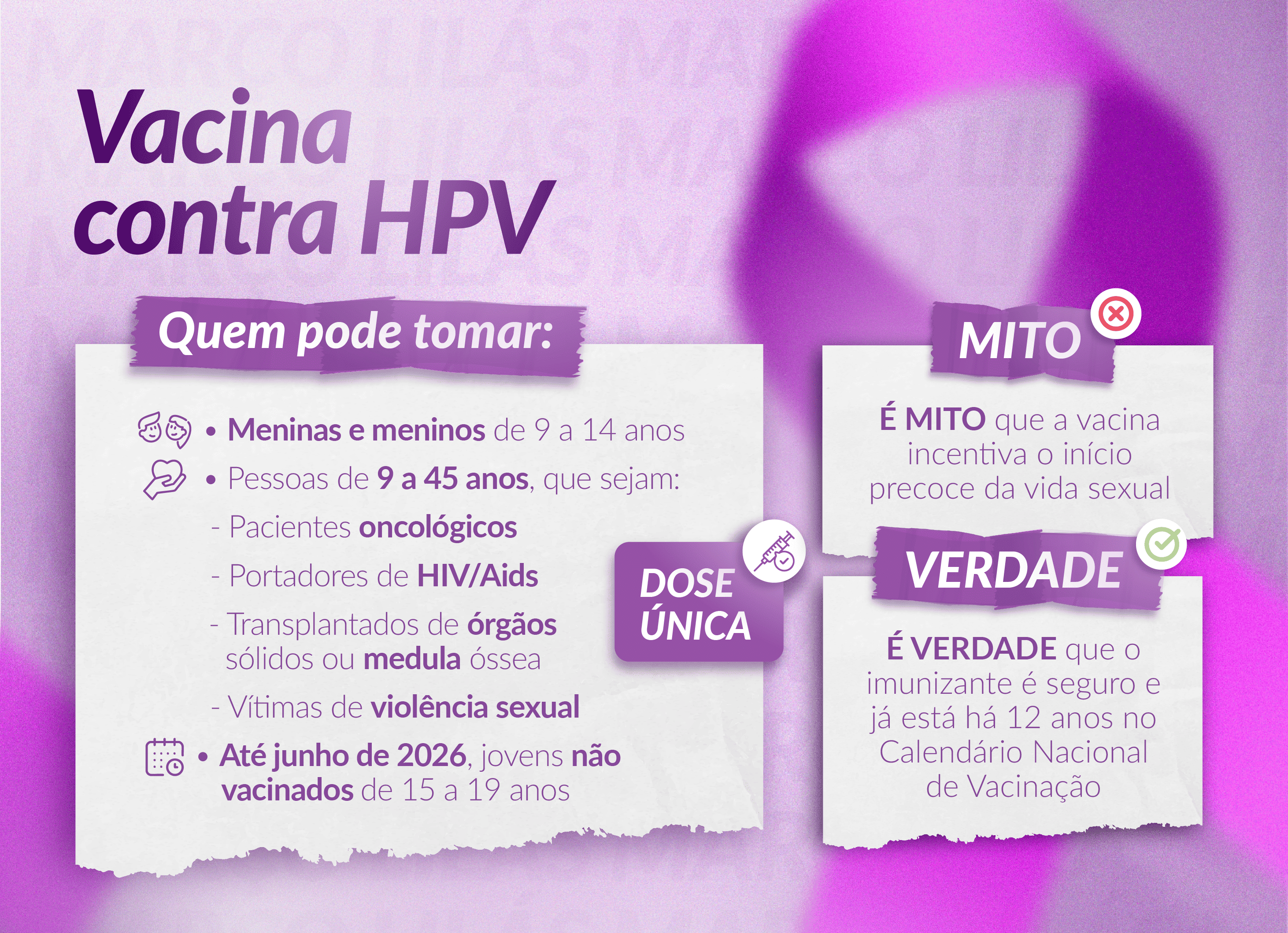Há 12 anos no Calendário Nacional, a vacina do HPV já mudou de público-alvo e até de esquema vacinal. No início, era indicada apenas para meninas, de 11 a 13 anos. A partir de 2017, passou a incluir os meninos e iniciou um processo de ampliação da faixa etária recomendada. Em 2022, também começou a vacinar imunodeprimidos e, em 2023, vítimas de violência sexual.