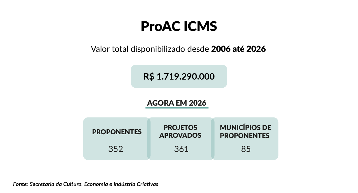 Segundo a Secretaria, até 2025, o ProAC aprovou mais de 31 mil projetos culturais e mobilizou cerca de R$ 2,6 bilhões em investimentos, considerando ambas as modalidades.