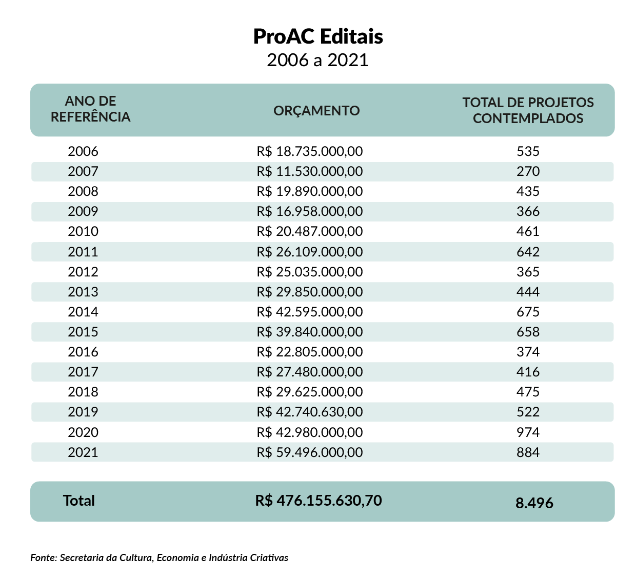 Entre 2006 e 2021, o ProAC Editais destinou quase R$ 500 milhões para cerca de 8 mil projetos, distribuídos em 570 editais. Já a modalidade ICMS destinou mais de R$ 1,7 bilhão desde sua criação. As áreas contempladas incluem música, artes visuais, teatro, dança, literatura e outras.