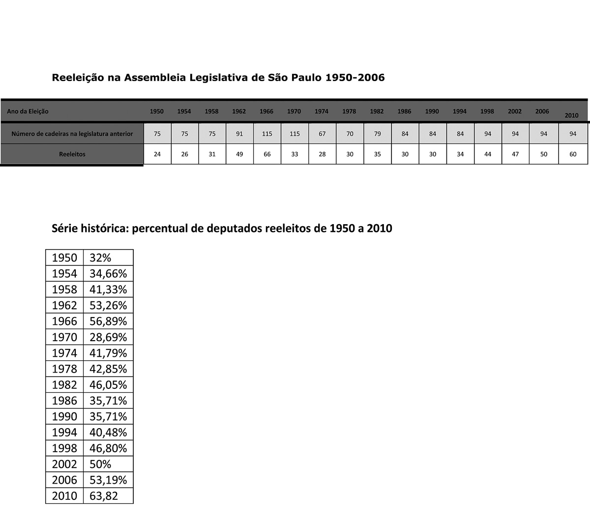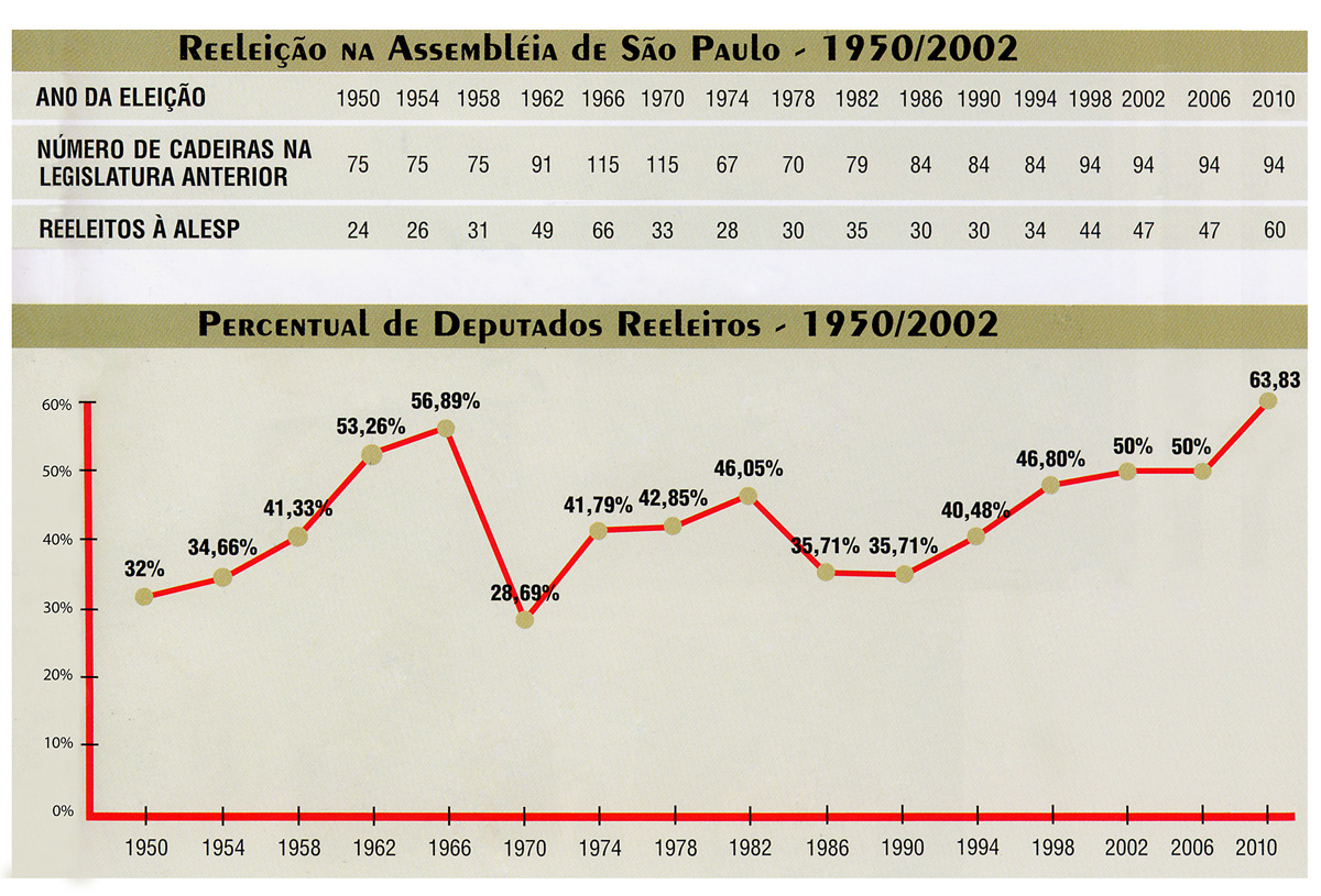 O índice de manutenção de 64% dos membros da Casa é bem superior à taxa histórica de reeleição na Assembleia paulista, que é de 43%, se considerado o período de 1950 a 2006. Na última eleição, em 2006, foram reeleitos 50 deputados estaduais e eleitos 44 novos parlamentares. Houve, portanto, uma renovação de 47% das 94 cadeiras do Legislativo paulista. A taxa de reeleição ficou em 53%.