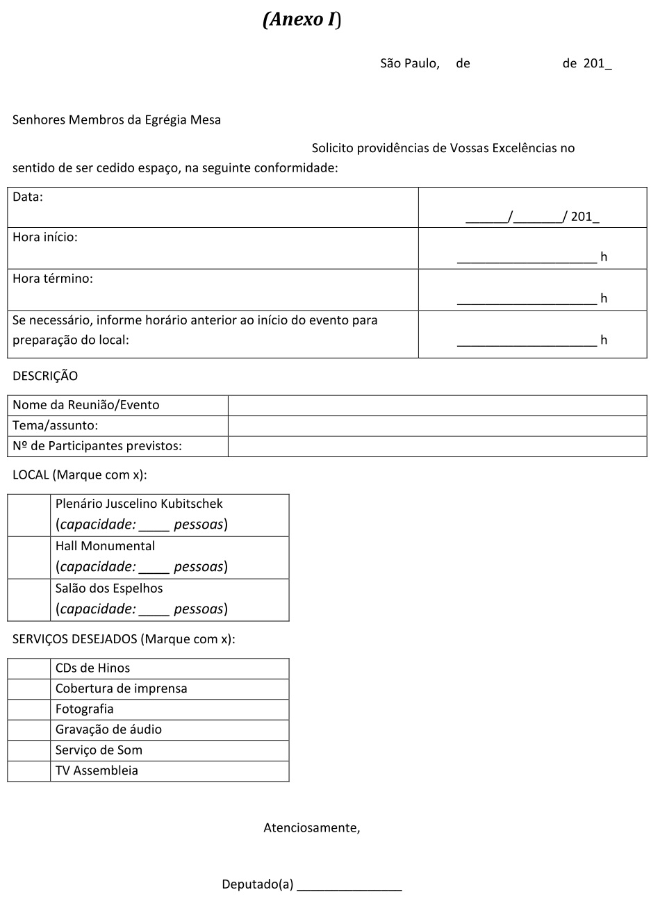 Artigo 2º - As solicitações de cessão de uso do Hall Monumental e do Salão dos Espelhos, serão dirigidas aos Membros da Mesa, e deverão dar entrada junto ao expediente do Gabinete da Presidência, por meio de formulário próprio (Anexo I), com antecedência mínima de 10(dez) dias antes do evento solicitado, sendo necessário um pré-agendamento.