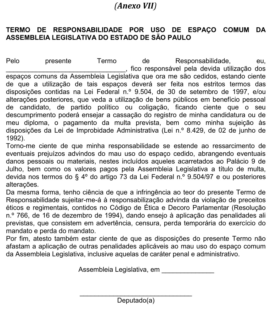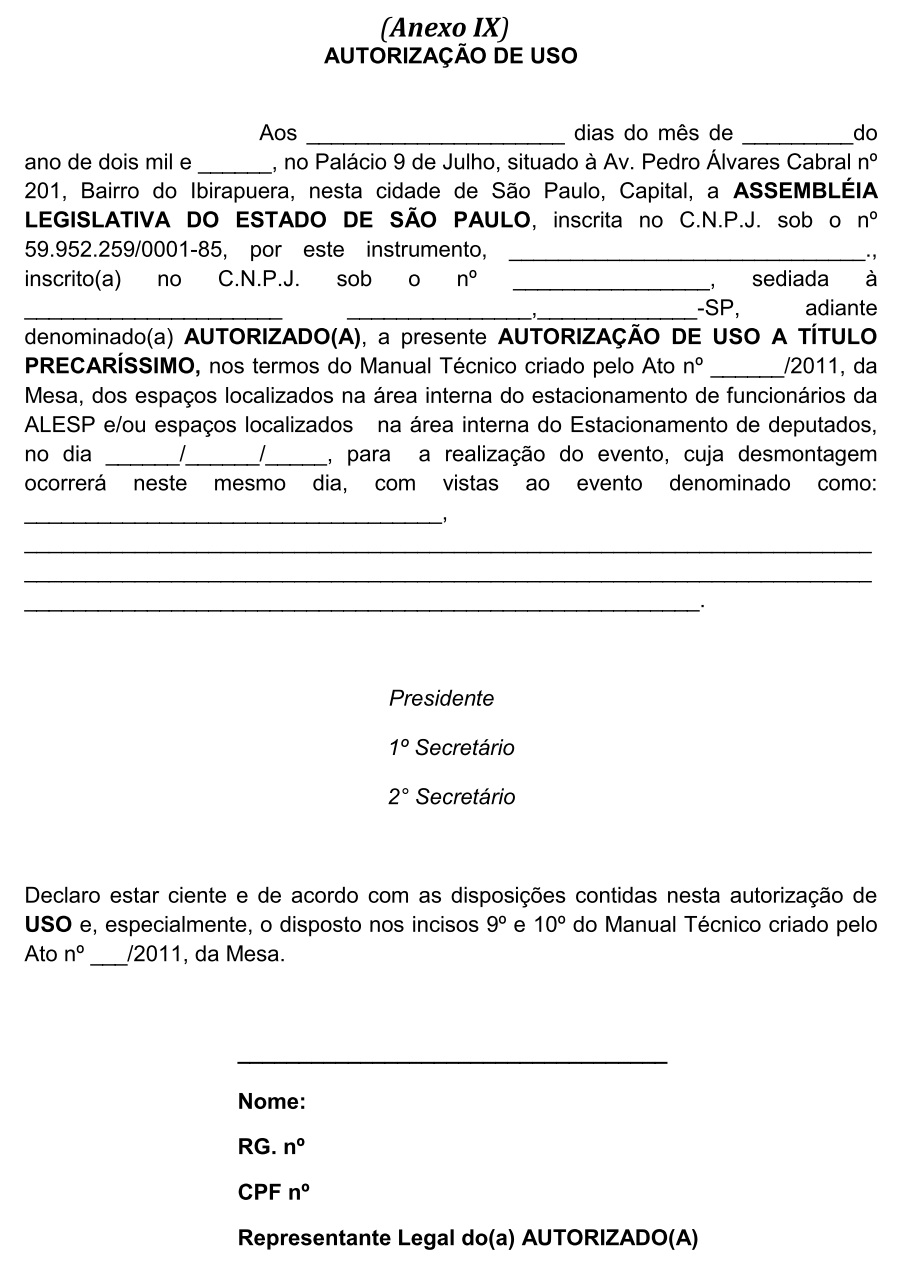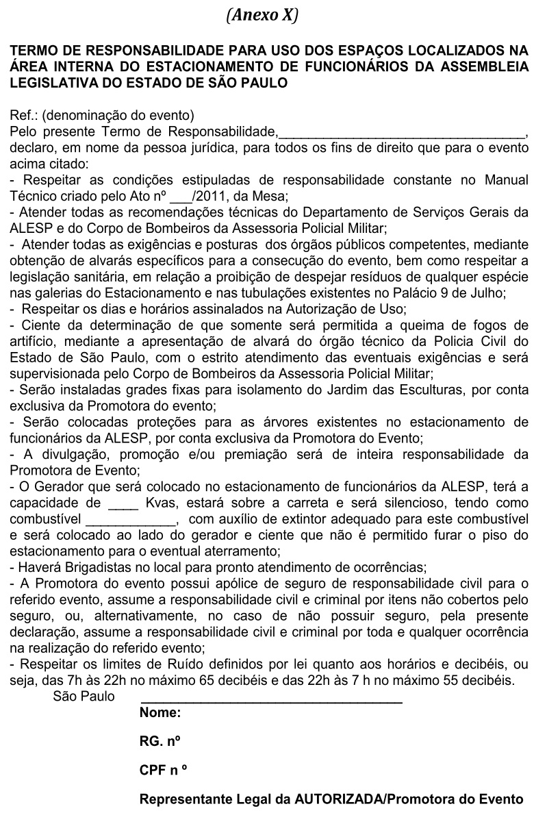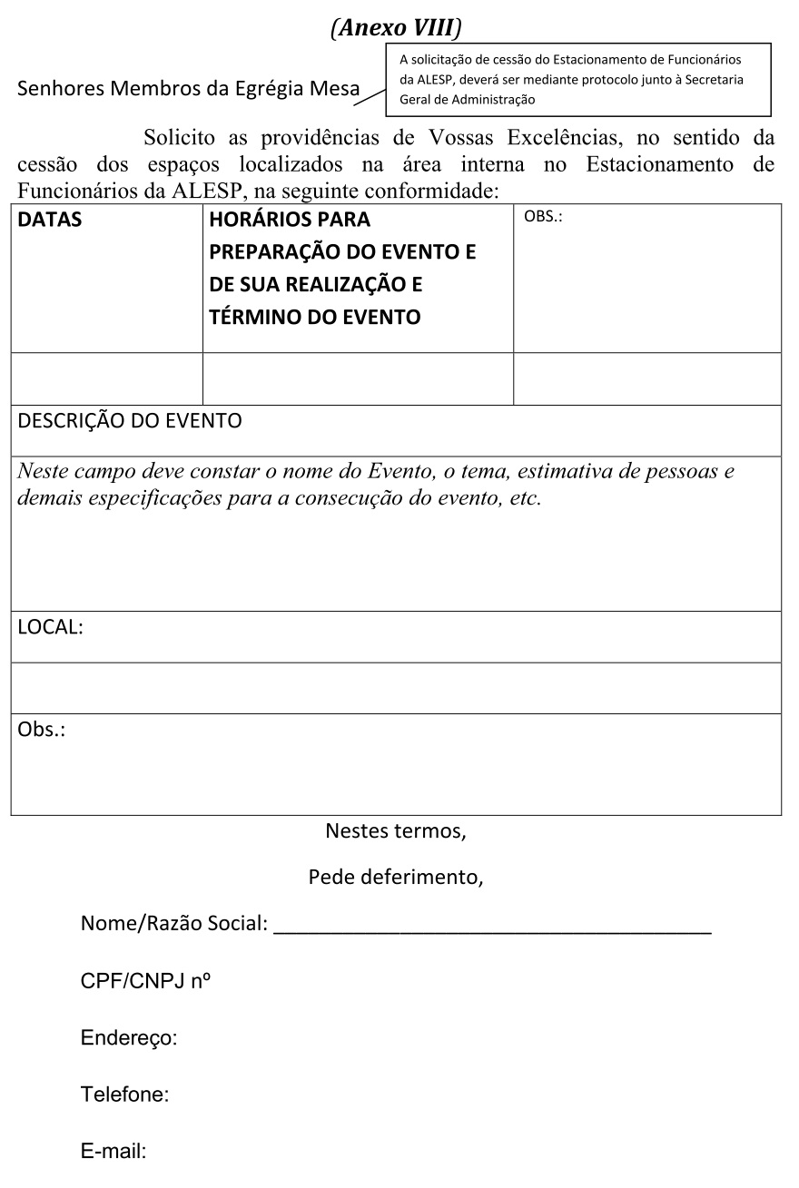 Artigo 18 - As solicitações de cessão de uso do Estacionamento de Funcionários da ALESP para a realização de evento, deverão ser dirigidas à Secretaria Geral de Administração, por meio de formulário próprio (Anexo VIII), com antecedência mínima de 20(vinte) dias da data marcada para realização do evento solicitado e, deverão dar entrada dos pedidos no Expediente da Secretaria Geral de Administração, sendo necessário um pré-agendamento com antecedência mínima de 30(trinta) dias. Os interessados deverão anexar ao formulário o Termo de Responsabilidade, devidamente preenchido e assinado (Anexo X) e da Autorização de Uso (Anexo IX), cujo conteúdo deverá ter tomado conhecimento, expressando-o por meio da aposição de seu “ciente”.