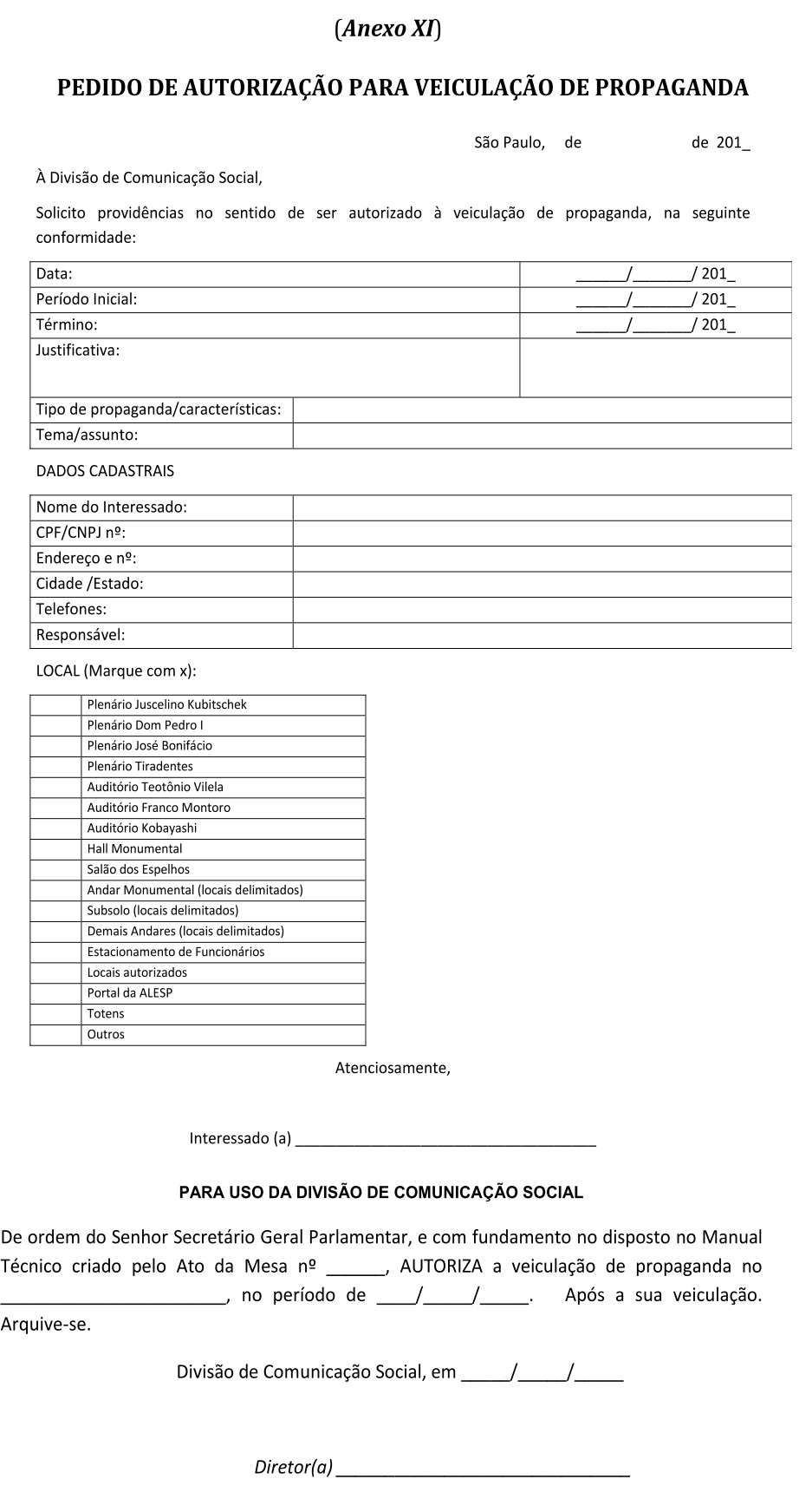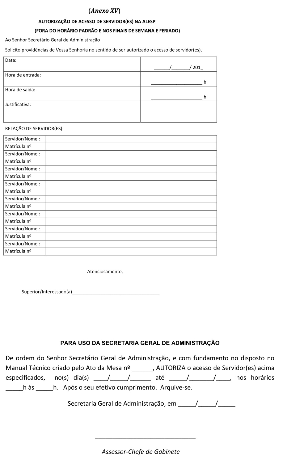 Artigo 118 - Os modelos de Formulários de diversas Autorizações constantes nos ANEXOS I à XV deste Manual Técnico, serão disponibilizados pela Administração e/ou via intranet da ALESP, a saber: